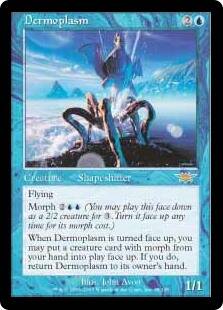 万马千军的Dermoplasm使用的机制主题已经常常出现了:让变形兽成为另一张不同的牌。这裡的风味是,当你变身Dermoplasm时,它可以变成你手牌裡的任何变身牌。从对局设计来看,这使用的是比较危险的区域,因为你可以将它变成你还没有法力施放的生物。