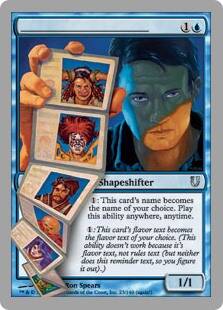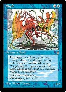 有趣的是,当时变形生物的特质纯粹只能变更自己的某个特性。不过设计者还是持续实验到底能变更什麽。到目前为止,我们看到了大小、异能,和颜色,以及一开始的直接複製。Shyft的生物类别不是变形兽而是Shyft。这在早期的万智牌中很常见。与其将某个生物归类到较大的类别中,比较古怪生物的生物类别通常都是它们的名字。