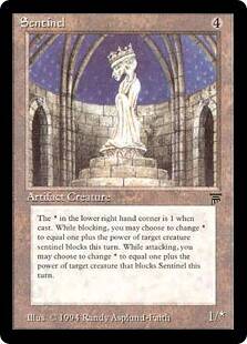 传承使用了另一种不同的机制方法来处裡变型。Halfdane和Sentinel都能以複製其他生物的方法来更改它们的攻防数值。和彷生妖以及Vesuvan Doppelganger不同的是,它们不会变成複製品,而只是利用另一个生物来重置它们的攻防。这两者也都没有变形兽这个生物类别,因为当时的传奇生物只有传奇这个生物类别,而神器生物一样还是没有生物类别。传奇要在非常多年之后才会更改为超类别。我得说一声,Halfdane是第一个被追溯更改为变形兽的传奇生物。