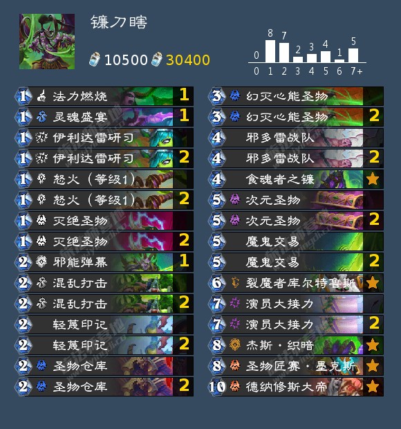 来自雅辛的镰刀瞎构筑。恶魔猎手的新卡构筑方向之一就是通过食魂者之镰(你的对手看不到食魂者之镰吃掉了什么,灵魂会以1费法术的形式像其他牌一样从牌库中抽到手上)将整套构筑法术化,进而触发轻蔑印记,邪多雷战队,魔鬼交易等法术化后单卡质量极高的卡牌的特效。有了这个思路,搭配上先前版本恶魔猎手获得的圣物体系(随从仅圣物匠赛·墨克斯)再额外补充邪能体系(随从仅杰斯·织暗)最终成型一套卡组,整体来说虽然是一套类标准的卡组(说到底也没几张狂野牌),但在试玩时的表现非常出色,法术化新卡的强度足够弥补至少是在试玩下的狂野环境强度,算是对圣物瞎一种潜在的补强,只可惜新卡只有魔鬼交易是邪能法术。虽然在狂野中有游荡恶鬼可以直接让食魂者之镰傻眼,但我觉得还不至于专门带上进行针对。