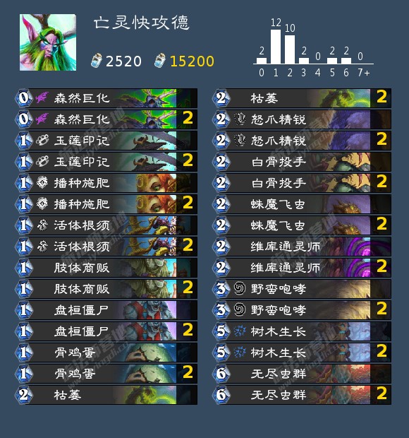 新版本给德鲁伊也补充了亡灵体系的快攻手段,盘桓**,枯萎,蛛魔飞虫等等。最值得一提的是无尽虫群,相信玩过快攻德的朋友都亲身体会过玩到游戏中期如果场面被解完还一手buff的痛苦,此时无尽虫群就能够续上一大口命并且让手里的buf继续有用武之地。过牌单卡应急木工,邪恶的厨师等灵活替换卡组中的卡牌。