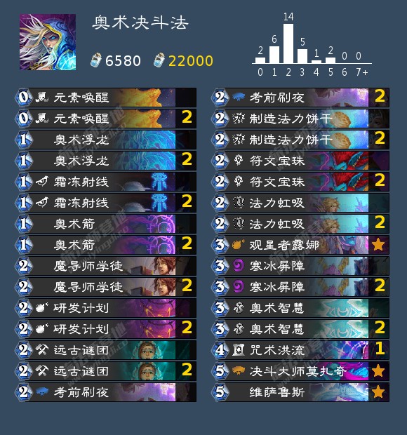 依靠新卡维萨鲁斯的双倍奥术法术效果以成型的一套决斗法。魔导师学徒是专属于奥术体系的巫师学徒,只要2费的消耗让决斗法再度成为可能。启动时注意制造法力饼干勿急于使用,这是可以配合维萨鲁斯完成电表倒转的牌。(所以什么时候能给研发计划加上奥术的词条呢)