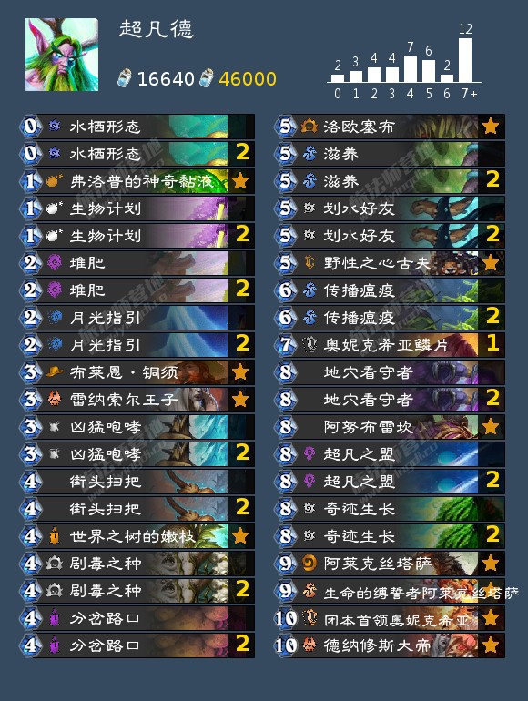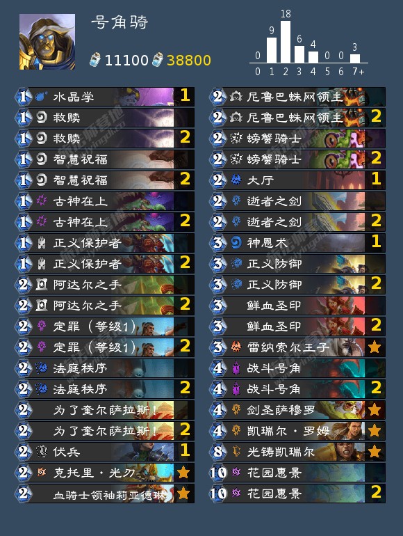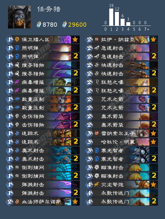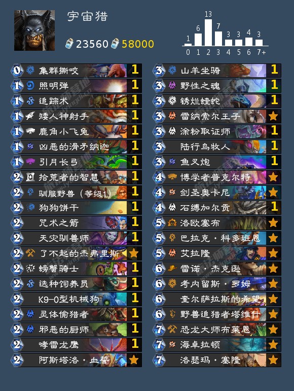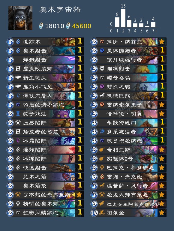 来自chen的宇宙猎构筑。着重提及陆行鸟猎人这一张卡的表现,这张卡在我个人看来要远大于远古时期的动物园中的大胖,基本上只要能在场上站住就没有输掉的可能。奎尔萨拉斯的希望和洛瑟玛·塞隆如果能准时打出,整套卡组的随从强度会达到一个无人能招架的程度。