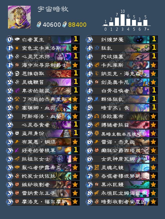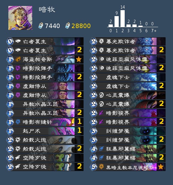 宇宙暗牧也可以**上亡灵体系,新版本给到牧师的亡语体系牌全都是完美的节奏牌,所有的牌均不存在亏卡一说,而且还多给了牧师暗言术:丧这样强大的aoe。虽然心灵咒术师也是亡灵会破坏白骨召唤者复活的下限,但这并不妨碍它在卡组中出现。女武神席瓦娜给的黑暗幻像相当于给了宇宙暗牧无穷尽后期资源的资本,宇宙暗牧的构筑一天天在走向完美。