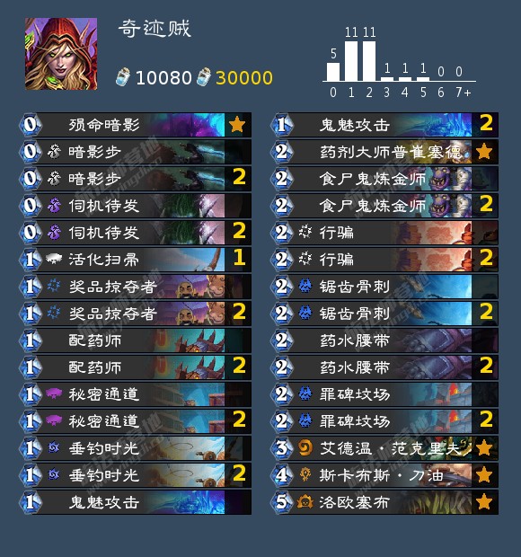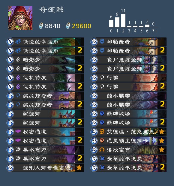 两套奇迹贼我就放在一起说。药剂体系是新版本对盗贼的重要补强,我认为药剂体系会是未来除鬼灵贼和快攻贼之外所有盗贼体系必定会携带的体系。药剂的效果堪比宇宙体系的卡扎库斯,甚至在我的视角里予盗贼而言要比卡扎库斯药水更胜一筹。并且,盗贼拥有食尸鬼炼金师以及暗影步,无论是在费用上还是在质量上都给予了盗贼巨大的操作空间。第一套卡组源自于试玩对手的套牌,第二套卡组来自于小C的预构筑。
