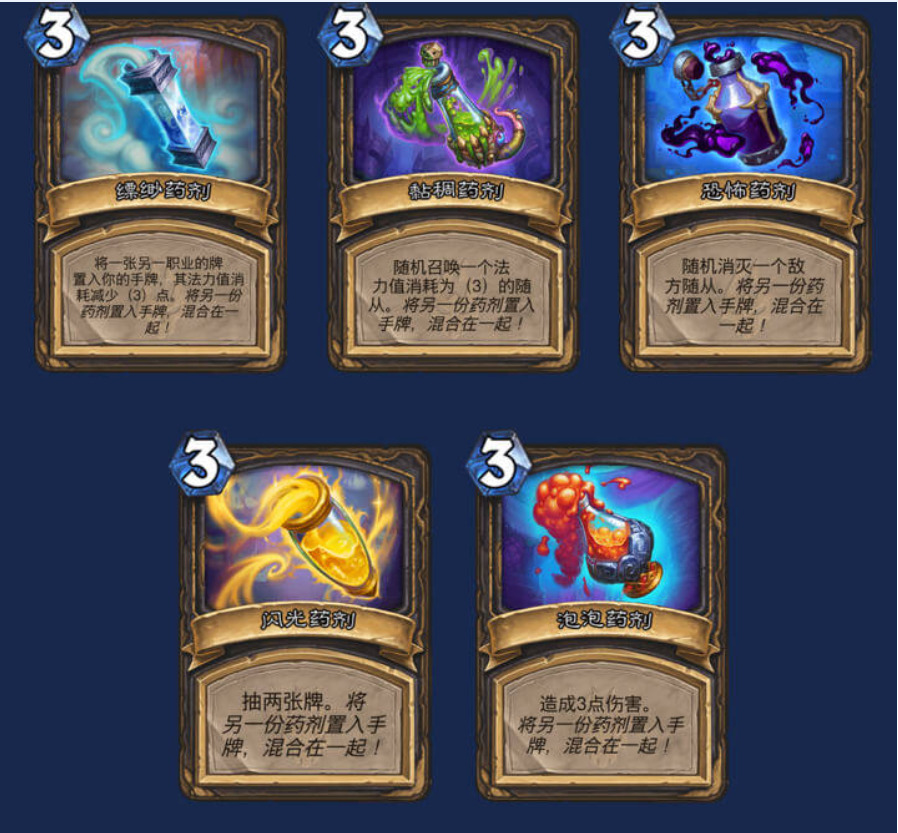 给大家复习一下药剂这个机制,以下的这些药剂效果都是单一的,如果你只有1份药剂,那就是单独的效果(如下图)。如果你有2份药剂,那么它们俩就会合在一起变成一张调好的药剂,包含2份药剂的效果。只有2份能合成,按置入手牌的先后顺序。