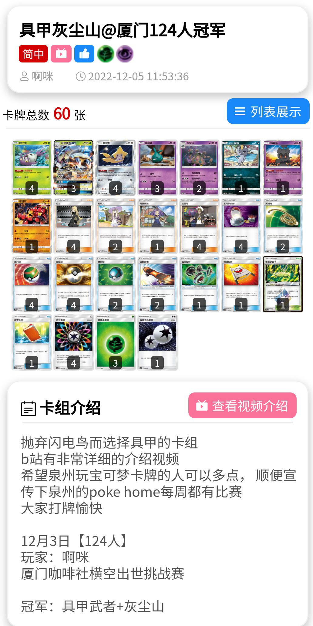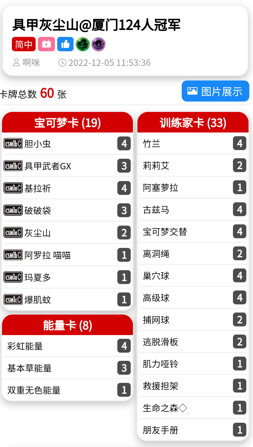[简中PTCG] 厦门横空出世挑战赛 冠军卡组 具甲武者灰尘山