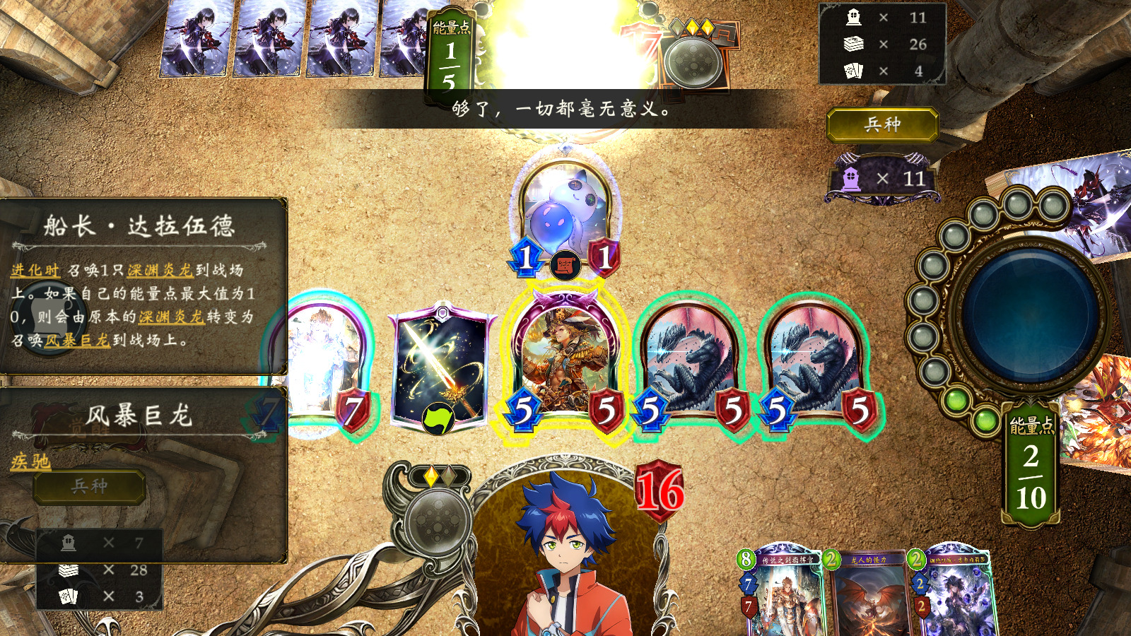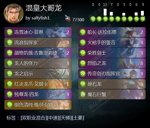 船长·达拉伍德可以在中期跳费,也能在后期通过爆能和进化效果召唤2个5/5疾驰的风暴巨龙,配合站场的传奇剑刃指挥官便可打出满血斩杀。