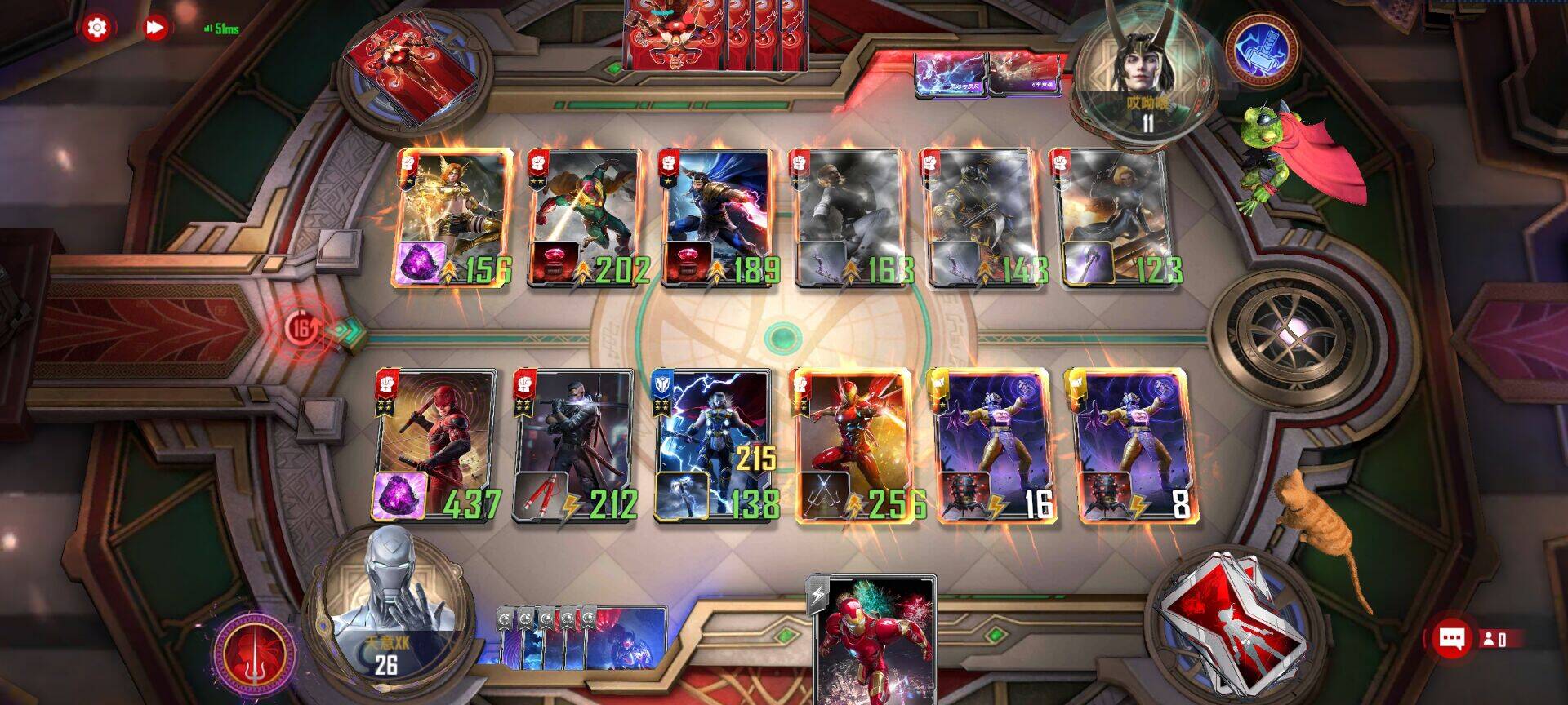 2费 小黄人一张就行,用了可以直接扔,省的卡位置,这套最不缺打出牌,是吧,夜魔侠,奥创复仇拉满,3费 缩小,金钱豹,血魔组件必备,4费加血,幻世,血魔节奏都是卡三本,你带的3费以下牌基本都过滤了,其他四费没杂牌,正义感召,直接拿幻世跟究极钢铁侠,碰见瑟曦,爆发,天林四将等需要幻世的时候,半天刷不到,不要慌,正义感召直接拿,5费感召拉满,等万能两星以上就可以拿究极钢铁侠了,看见幻世,看下这座有没有蜘蛛侠,有可以留手里,力量宝石两张,一般不买,后期比如跟海拉打,可以给一号位夜魔侠或者刀锋带上,抢先手,然后带叉子的万能双动去刺杀苏特或者刽子手,在或者后面需要安吉拉刺杀给他带力量宝石,买一张牌库留一张继续烧,6费九头蛇动员,比如打法师,山火巫毒,熊猫,小小,小淘气,三狼。。。可以用,手套我只有一个,有几个就带几个,** 接下来看几把和天梯主流卡组的实战