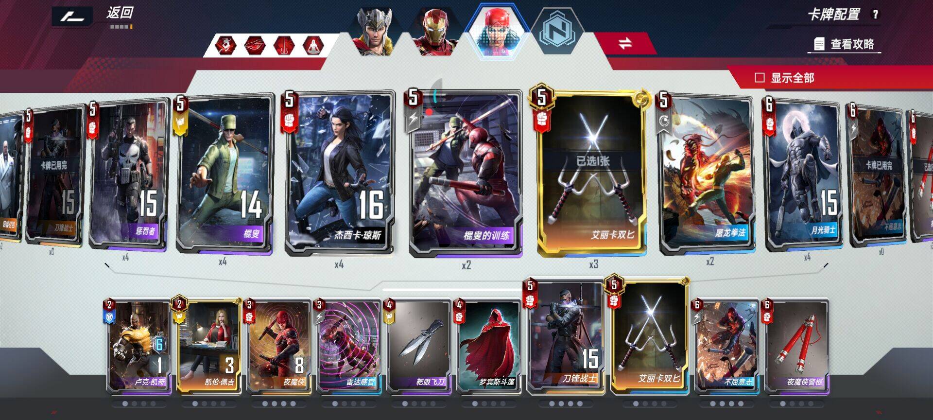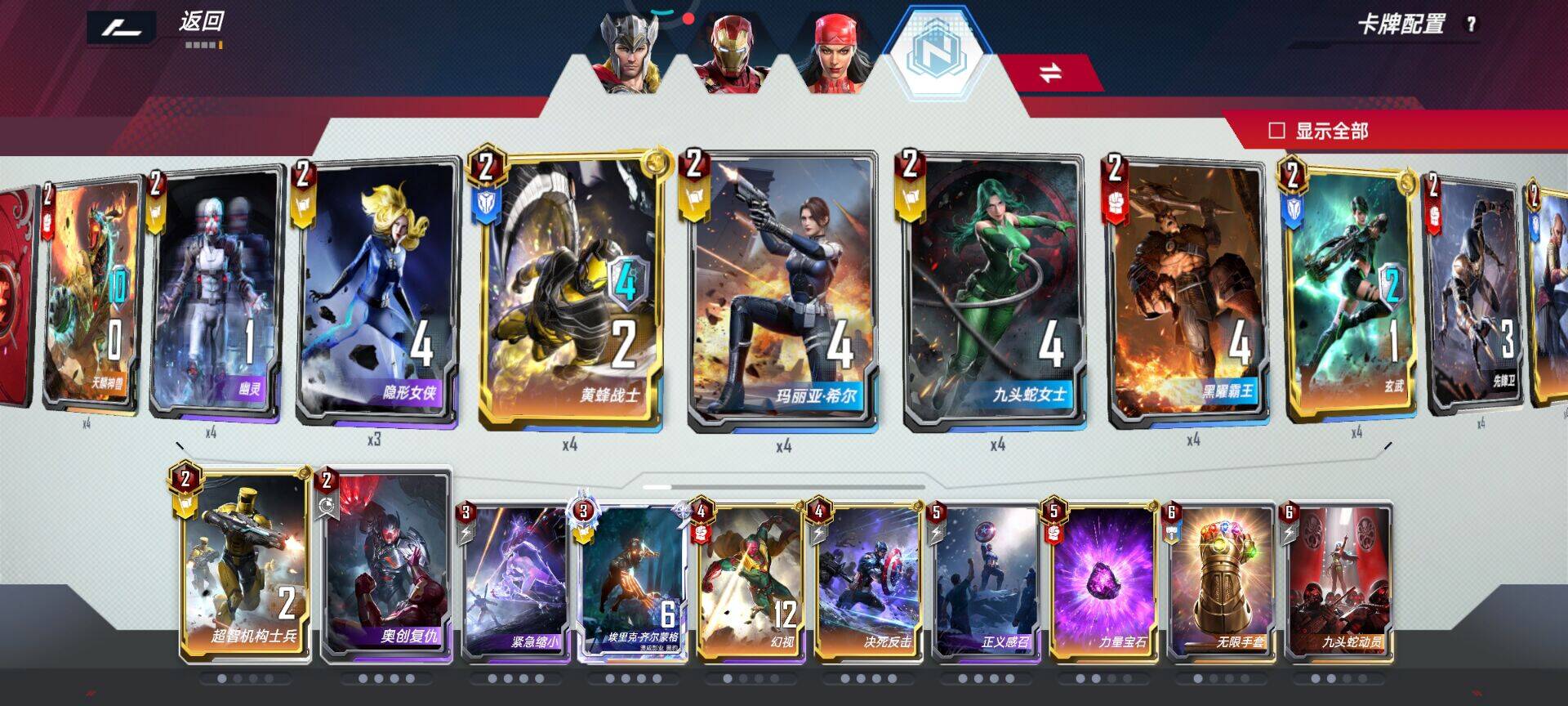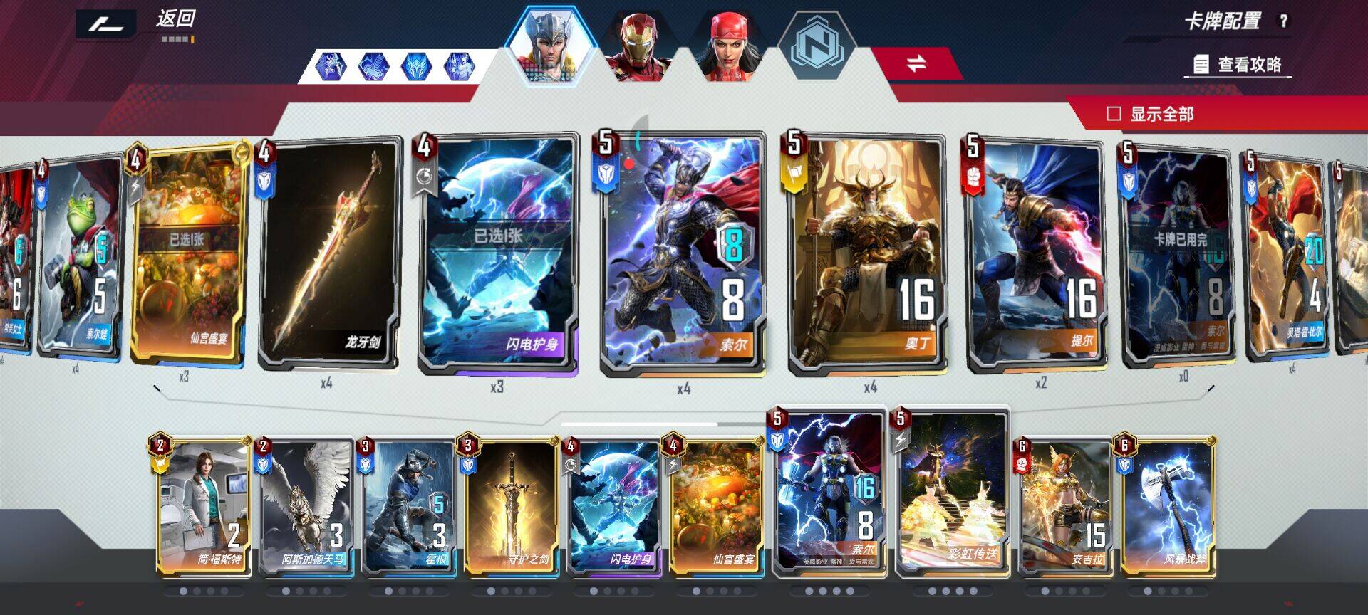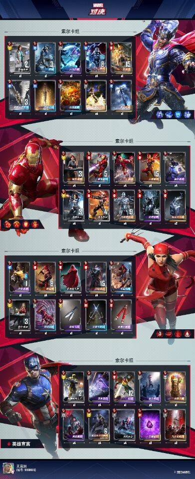 卡组构成;索尔, 艾丽卡,钢铁侠。本套卡组的核心 新索尔,刀锋,以及带叉子的多动万能,万能主要配究极钢铁侠给新索尔和刀锋涨身材,在配上四败奥创复仇,后期全员都是200起步,一星幻世,不带装备后期都能吃爆炸,打7之后,夜魔侠都能养到吃**锤击,众所周知,大身材的刀锋跟新索尔几乎都是一挑6的存在,下面详细说明。 索尔部分