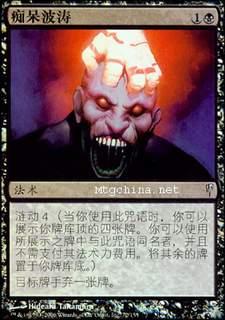 磨牌还有个好处是你的牌堆里未知牌减少了。(假装自己刺探3全放进坟)我从Cedric Phillips那儿听来一个很好的例子。他当时在打骤霜环境的限制赛比赛。骤霜里有一个涟动4异能(“涟动N”指:当你使用此咒语时,你可以展示你牌库顶的N张牌。 你可以使用所展示之牌中与此咒语同名者,并且不需支付其法术力费用。 将其余的牌置于你牌库底。)因为是明牌表,所以Cedric知道对手只有一张涟动卡,但对手还是选择展示4张牌放到牌库底。他一开始很震惊,后来想明白了,知道哪些牌是摸不到的也是有效信息。游戏的输赢并不会被自磨影响,勇敢地把自磨牌放进卡组吧。