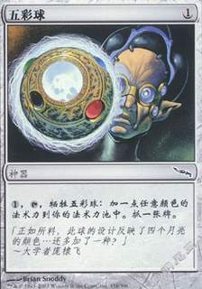 五彩星和米斯拉的饰品有类似的作用。此外还有两条提醒,第一条还是挺显而易见的:和五彩球不一样,五彩星的第二条抓牌效果并不需要第一条异能来触发,用潘瑞冈蛮牛之类的牺牲源牺牲也能抓牌。第二条就是最好等回合开始之后再把五彩星掰掉抓牌。我经常看到对手在我回合结束末掰掉五彩星抓牌。这在某些情况下是对的,但大部分情况没什么收益。可能很多人都形成了在对手回合结束时花光自己法术力的肌肉记忆,本能地把五彩星循环掉了。实际上它的调色是免费的,一点进一点出。完全可以等下一回合抓牌之后再决定要不要循环掉。可能正好抽上来一张强能石注能需要贴在五彩星身上。