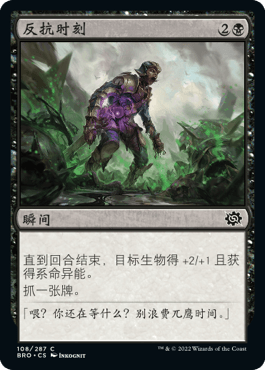 振翼机技师也是同理。抓二加豆的回报确实非常诱人,但有时候要做的就是换掉对手的二费生物。尤其是面对红绿aggro,一个3/1踢过来,该挡则挡。何况换掉本身还能造个1/1飞机,已经不亏了。盖亚赋礼是一个更典型的例子,它十分全能,攻防都有作用:进攻时能补上关键的几点伤害,也能让阻挡生物多挨一脚或者给炸弹保护。类似的战斗trick还有反抗时刻。对方地全横了,也不用生物阻挡准备race。这时我让自己3攻生物踢上一脚回五血抽卡也十分关键。等对方费用开放,可以用去除时,就不一定能用出来了。理想状况下总是用小生物换掉对方的大生物,可有时早早用掉,抽到那张未知牌更重要。