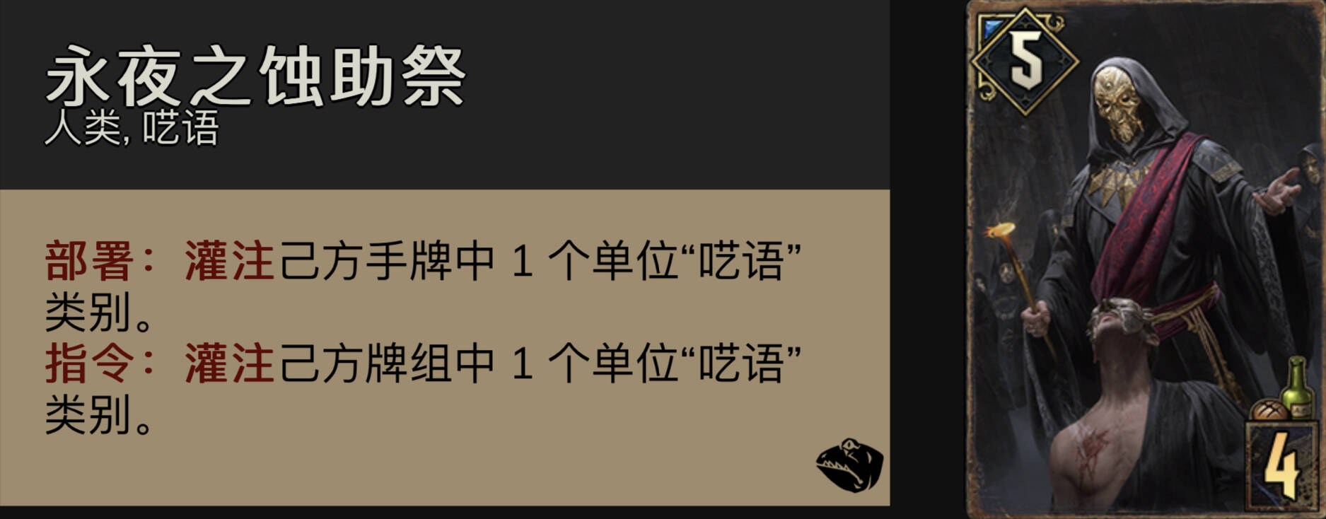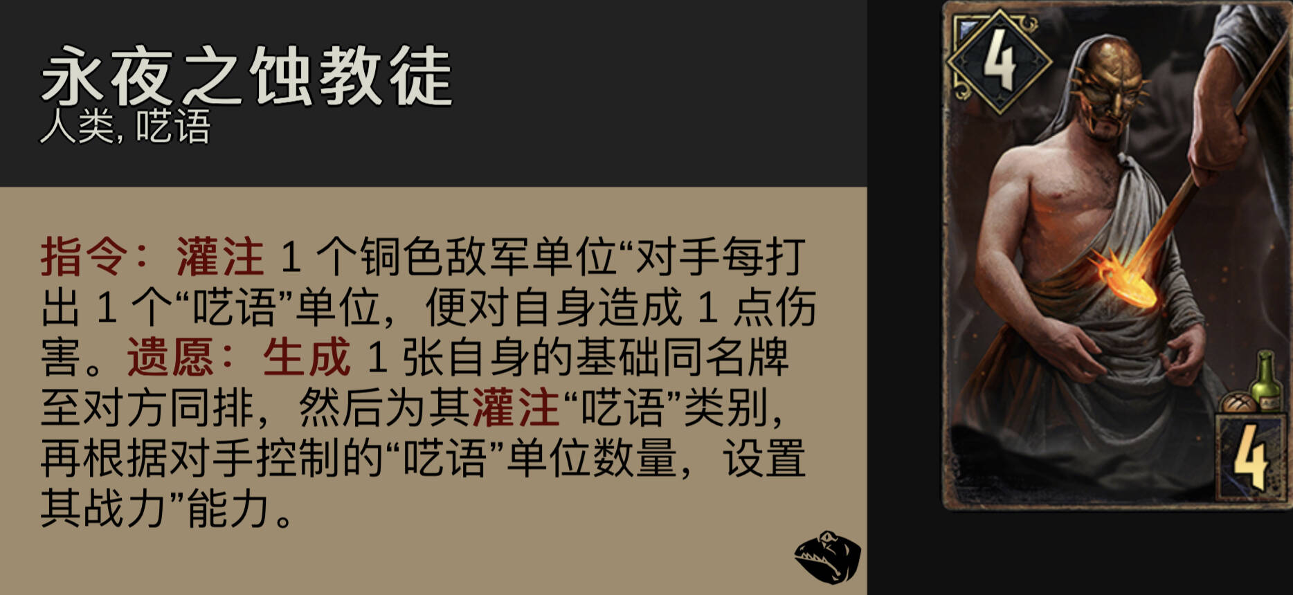 6、 永夜之蚀教徒:卡组另一个核心单位,只能灌注铜卡,一般灌注能打的死的单位就可以,对手如果可能有净化可以留着最后一起灌注,如果有去除能灌就灌。特别需要注意被锁定单位是不能触发灌注效果的,如果领袖锁了铜卡灌注了也是无效的。