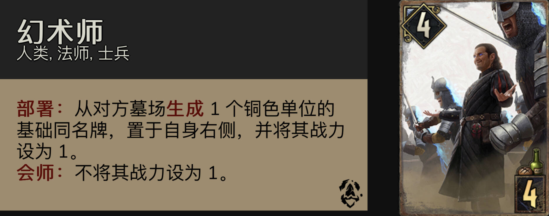 9、 幻术师:首先注意本体是士兵,对手赢得一小局后打出会拉那乌西卡旅,需要控制好。一般都用来拉对手坟场里的教徒,拉出的1点教徒还是传送术不错的目标。R1没有操作者的话没什么用,起手第二个可以换掉。