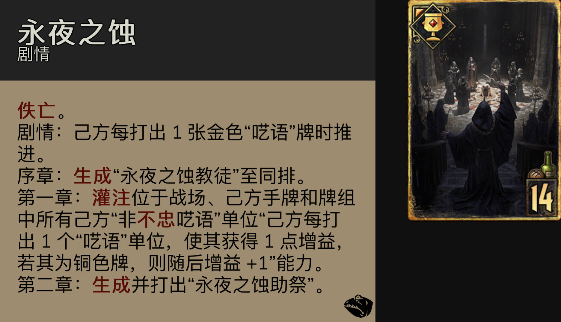 3、 永夜之蚀助祭:卡组核心,且只有解梦和卷轴可以检索,R1没有助祭和剧情优先检索助祭,打完助祭pass R2剧情抗逼。传送术和死灵术前期目标都是助祭,一般灌注个3次就够用了,多余的可以留在后面重复打出教徒或者助祭点数也很大,不用强求R1全部用完,另外需要注意传送术不能传送佚亡单位。灌注顺序原则上为亚凡>丹德里恩>那乌西卡旅=薇歌>=需要读剧情的金卡>其他金铜>不忠单位。