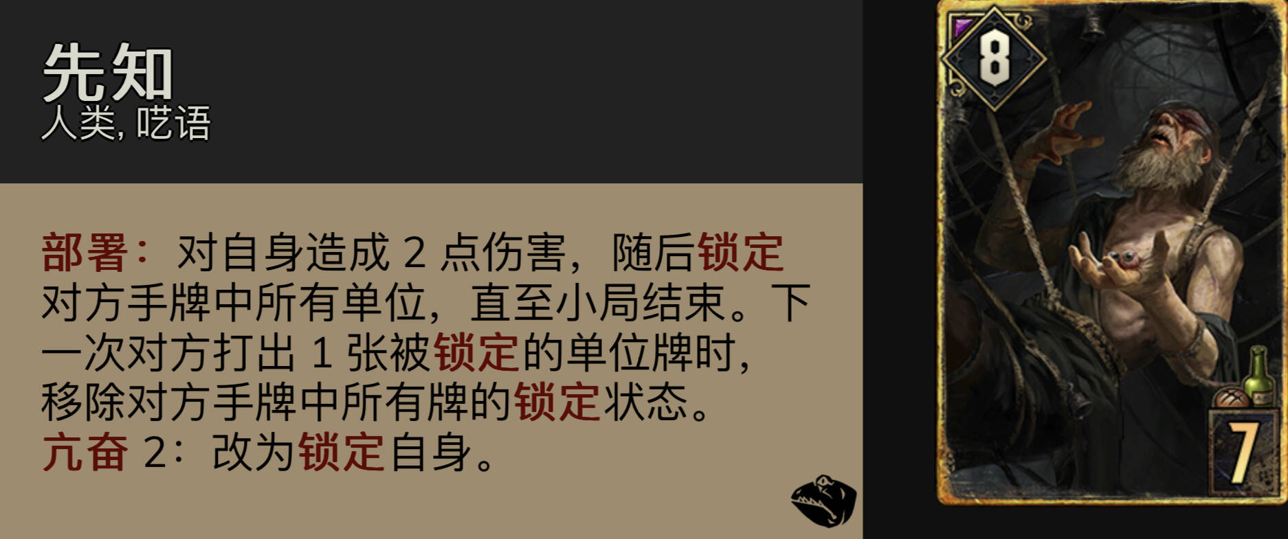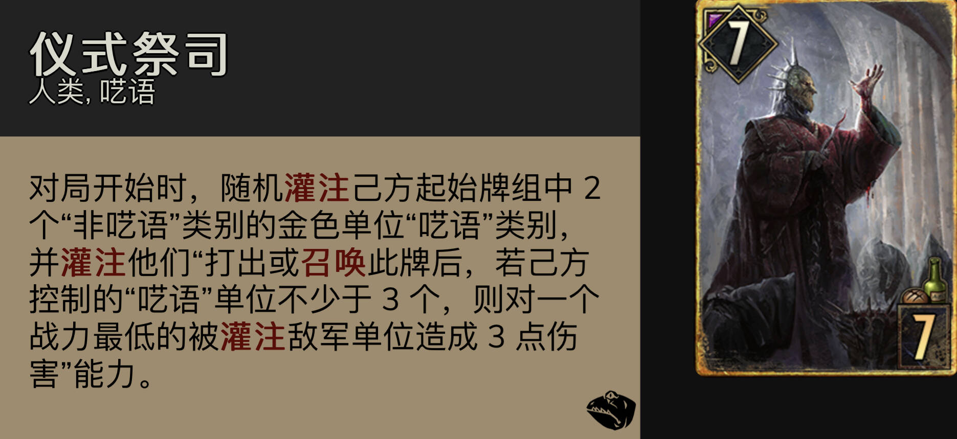 5、 先知、仪式祭祀:本体就是呓语,必带,先知可以用来卡关键单卡,但需要注意亢奋2,合理安排牌序。仪式祭祀开局可以灌两个,本体就是个用来读剧情的白板,不过7点能躲过大部分去除,很优质。