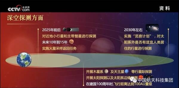 我国计划2025年前后发射深空探测器,对近地小行星和主带彗星进行探测。计划在未来10年到15年实施火星采样返回任务。计划开展木星系、天王星等行星际探测,开展太阳探测以及太阳系边缘探测。计划在2030年左右实施“觅音计划”,对太阳系外是否有适宜人类居住的行星进行探测。