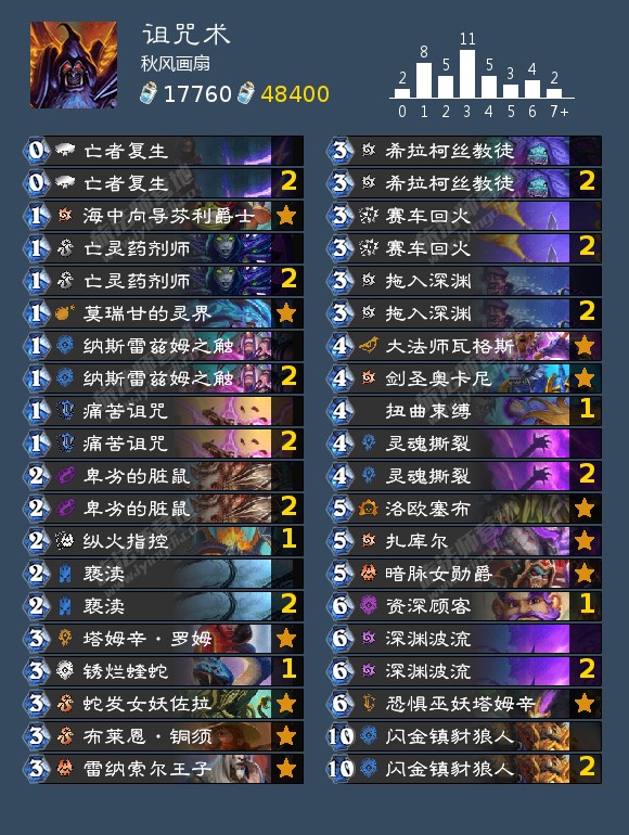 重量对局其二,也是天梯一霸。留牌按奥秘法留,留灵魂撕裂等能解中型怪的解和诅咒、站场牌,曲线压低,把中期节奏拿到