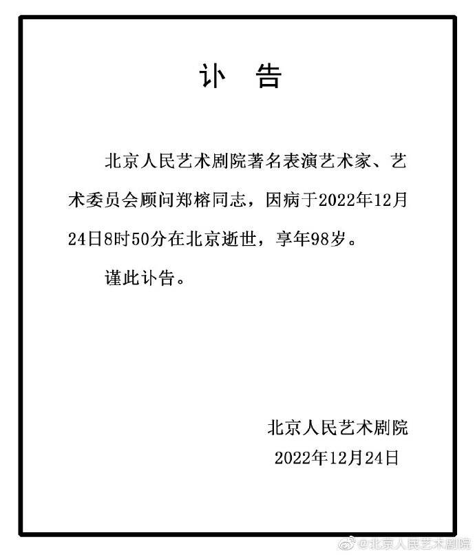 北京人民艺术剧院发布讣告,著名表演艺术家郑榕去世,享寿98岁。