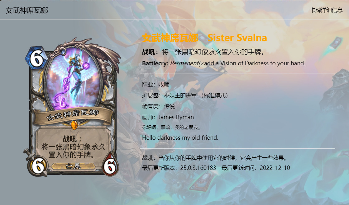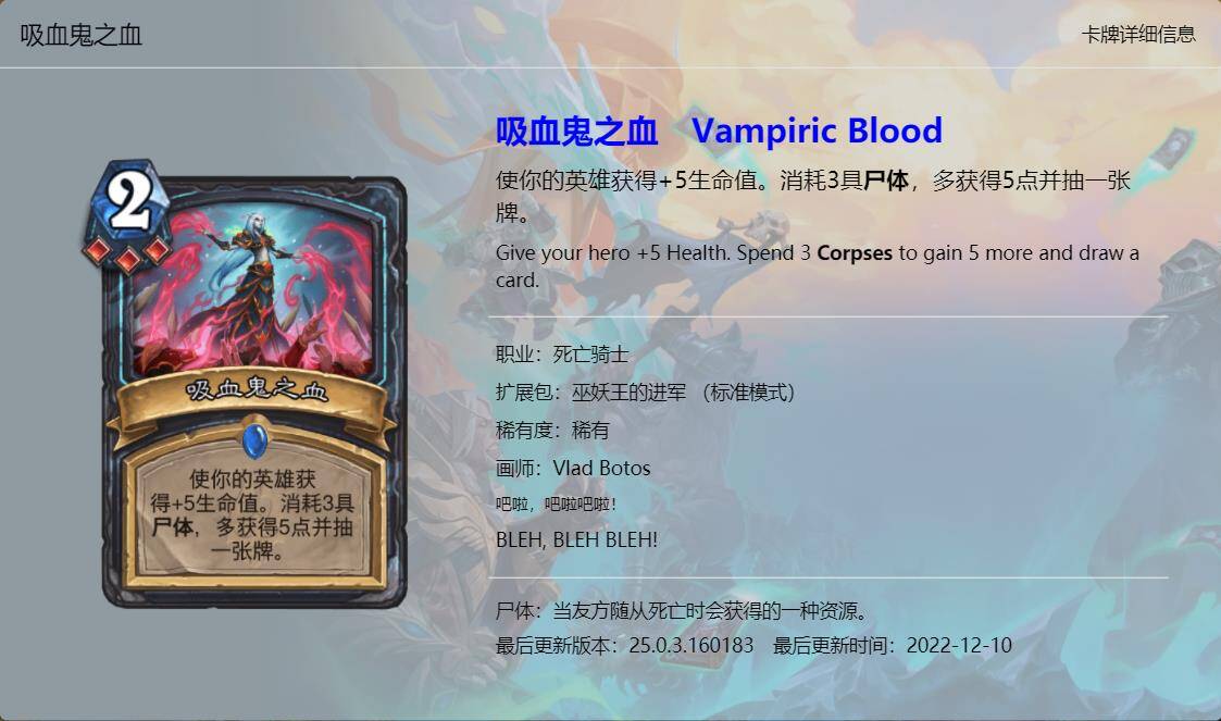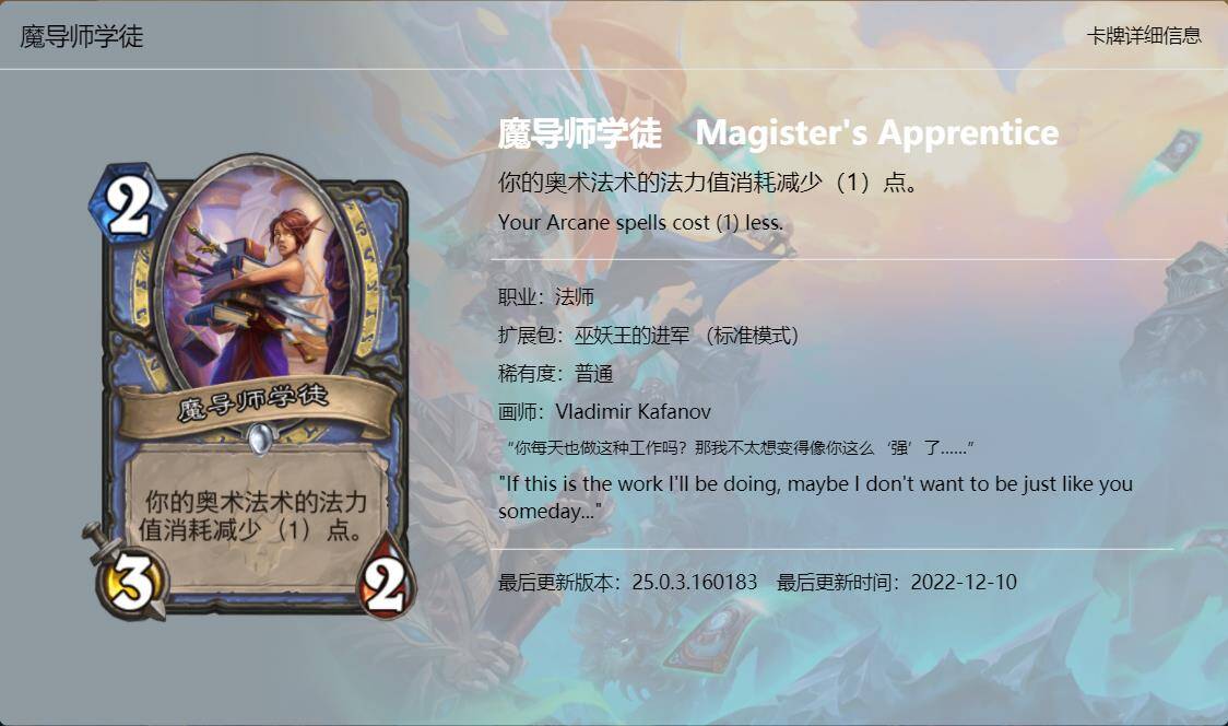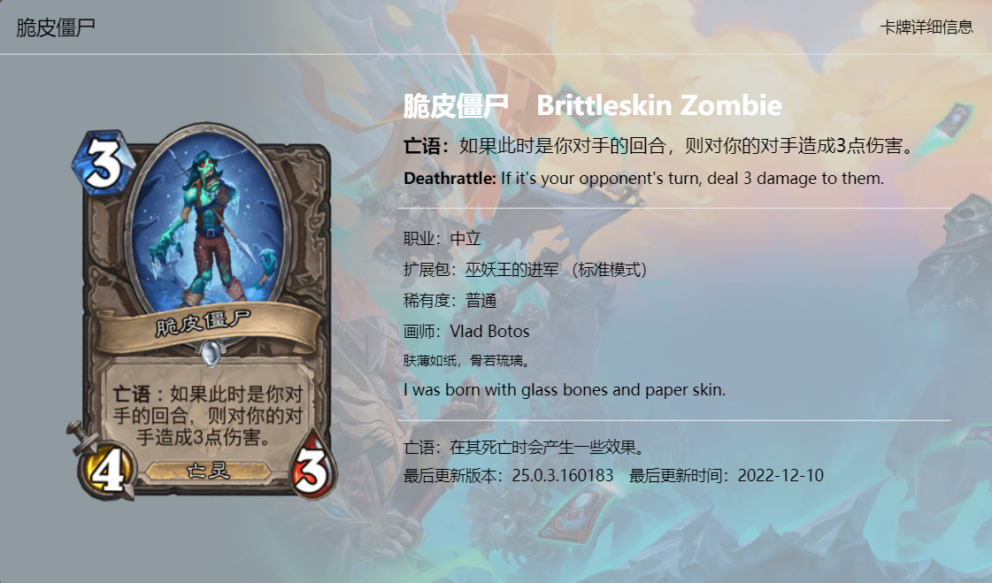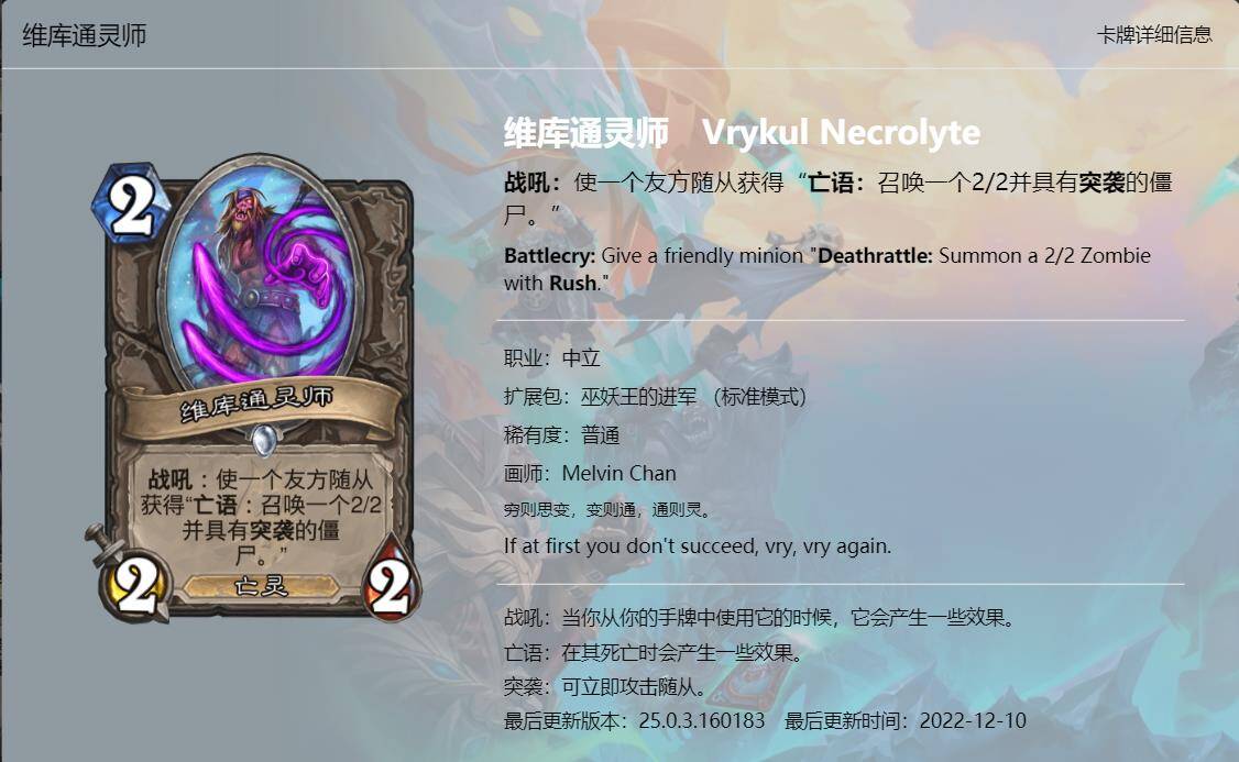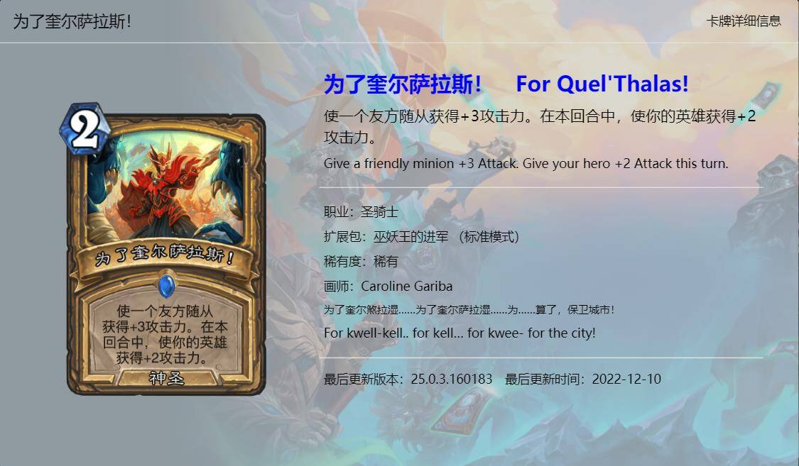 大家好,我是清风。炉石传说新版本《巫妖王的进军》已经上线一段时间了,虽然说炉石国服再有一个月就要关服了,不过新版本的本地化工作依然做的很不错,所以我们也有始有终,来看看这最后一个版本新卡的卡牌趣文又玩了哪些梗吧,个人见识浅薄,难免会有所错漏,欢迎大家在评论区补充。