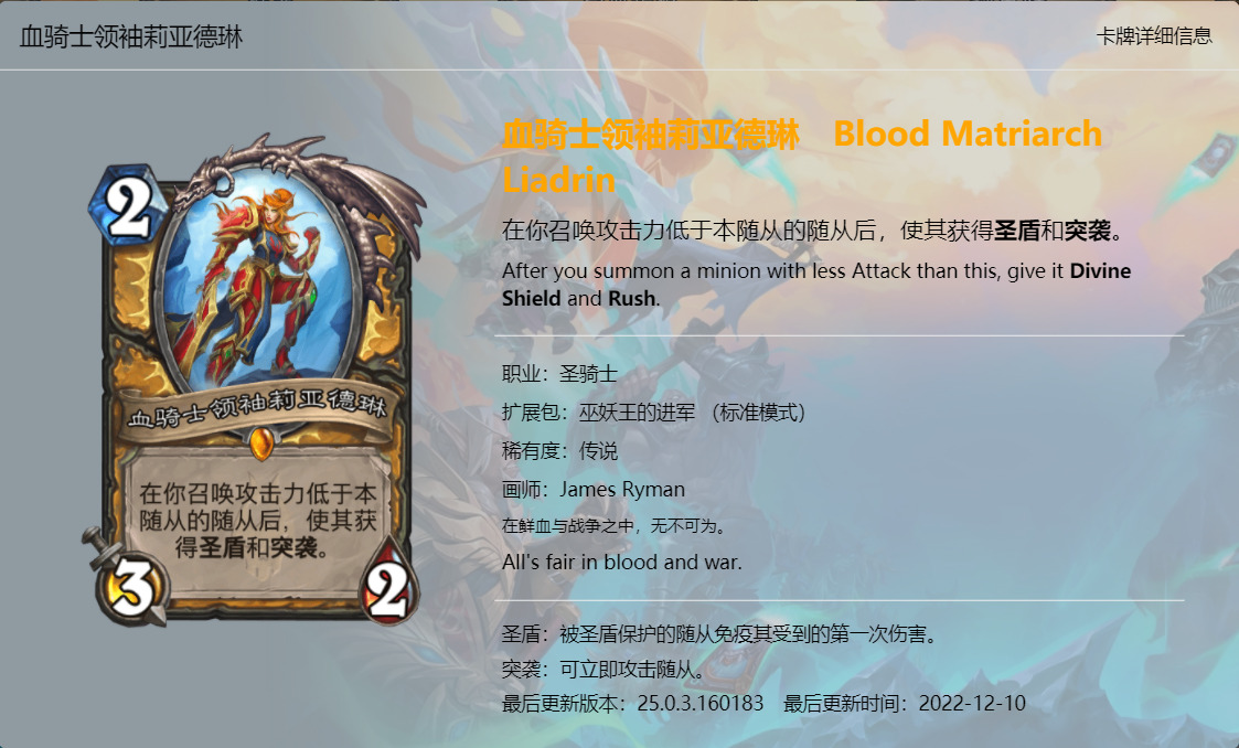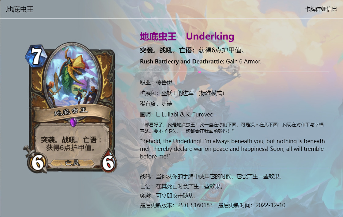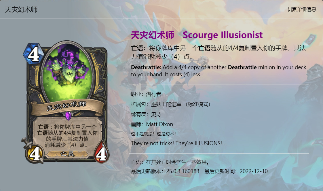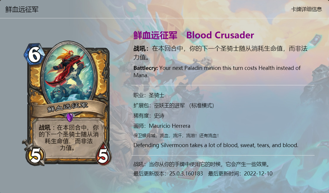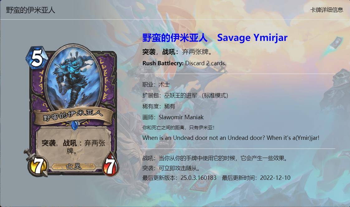 大家好,我是清风。炉石传说新版本《巫妖王的进军》已经上线一段时间了,虽然说炉石国服再有一个月就要关服了,不过新版本的本地化工作依然做的很不错,所以我们也有始有终,来看看这最后一个版本新卡的卡牌趣文又玩了哪些梗吧,个人见识浅薄,难免会有所错漏,欢迎大家在评论区补充。