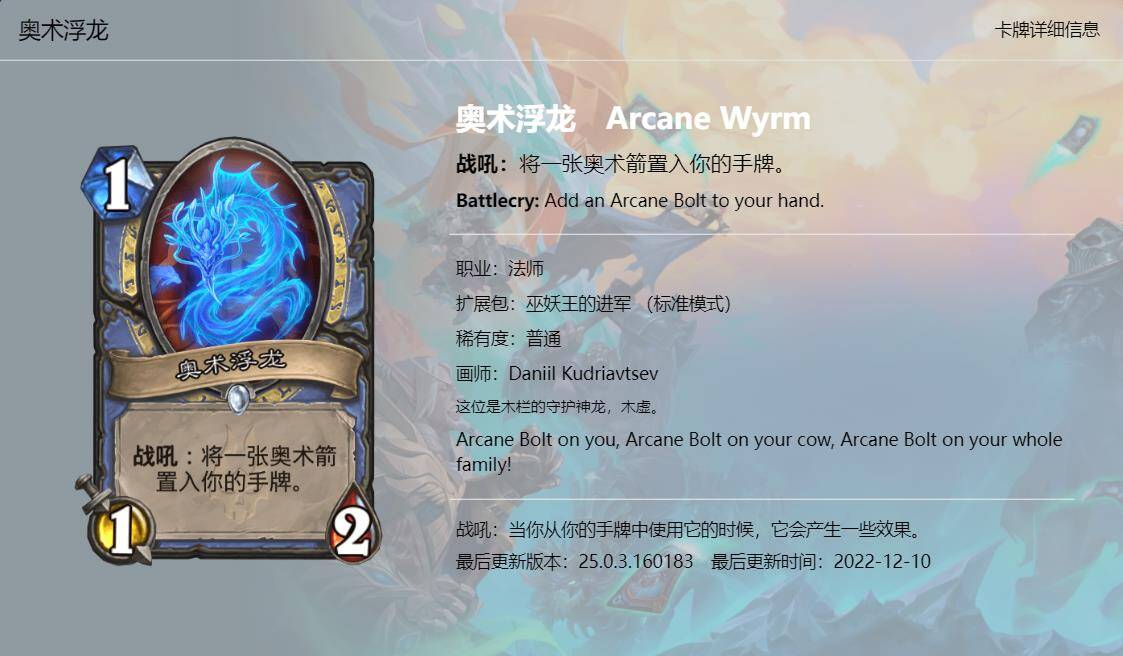 这张卡牌的趣文看起来中英文完全不对照,英文原版在说用奥术箭打***,而中文在讲很奇怪的东西,实际上本地化做的还挺有意思的。因为这张牌英文版的卡牌趣文出自经典的迪士尼电影《花木兰》里的台词,原话是“Dishonor on you, dishonor on your cow, dishonor on your whole family!(丢了你的脸,丢了牛的脸,丢了你整个家族的脸)”。