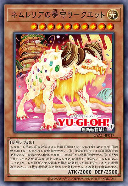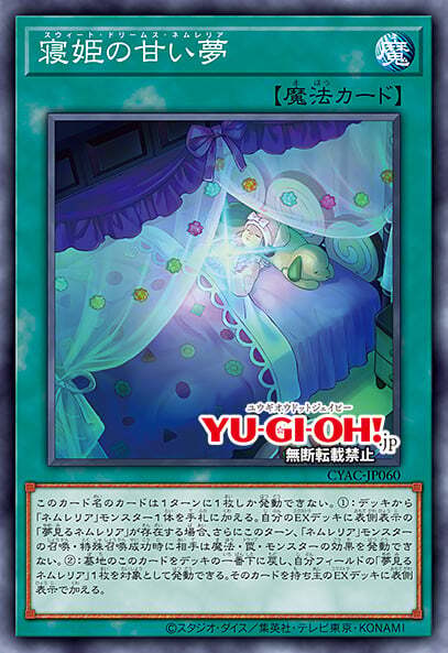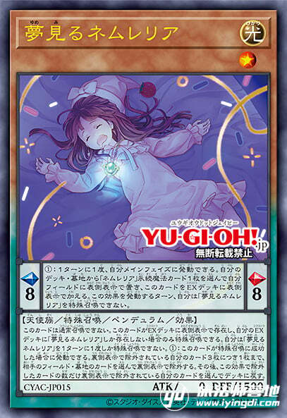 ①:从卡组把1只「ネムレリア」怪兽加入手卡。自己额外卡组有表侧表示的「夢見るネムレリア」存在的场合,再在这个回合,「ネムレリア」怪兽的召唤·特殊召唤成功时让对方不能把魔法·陷阱·怪兽的效果发动。
