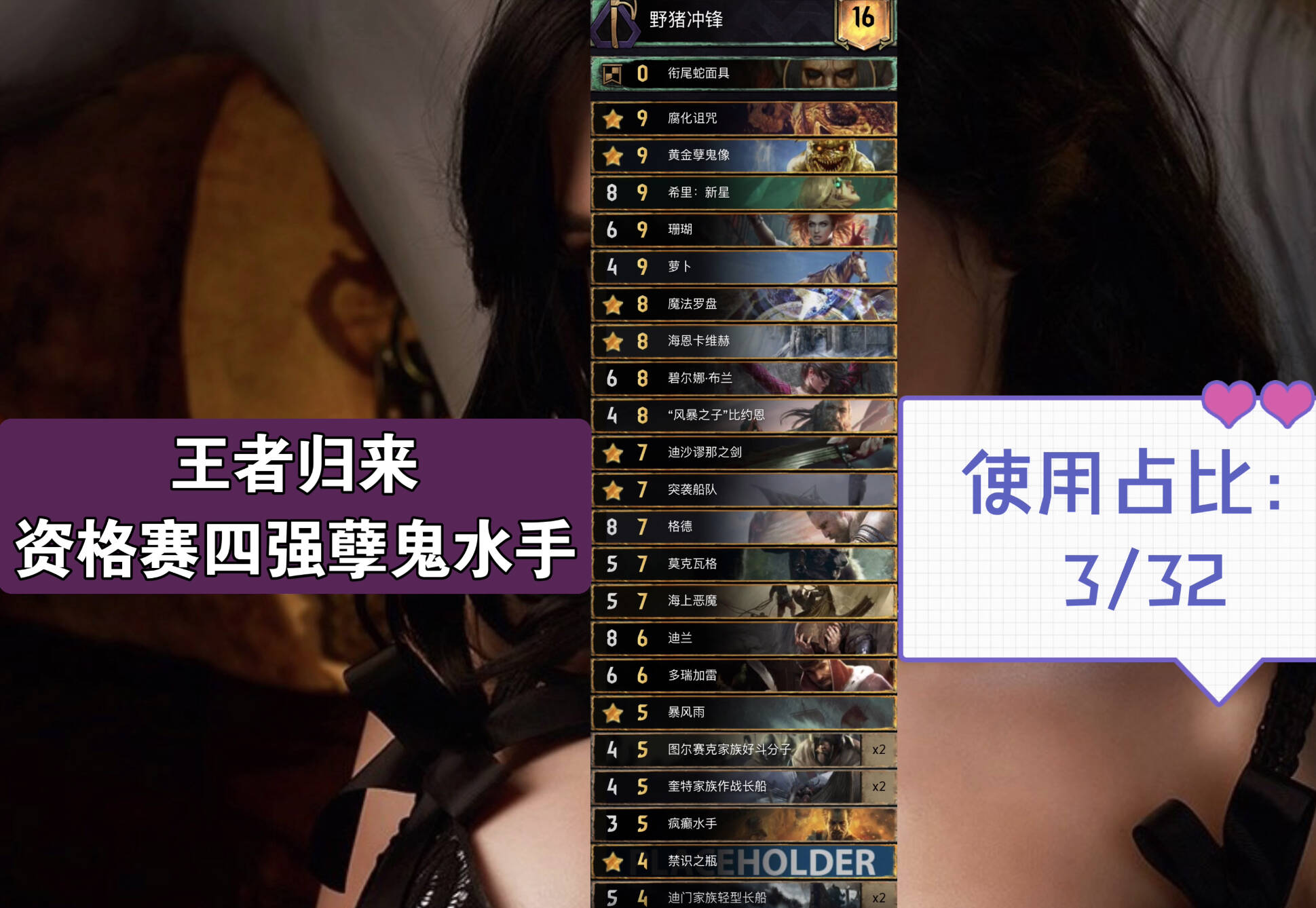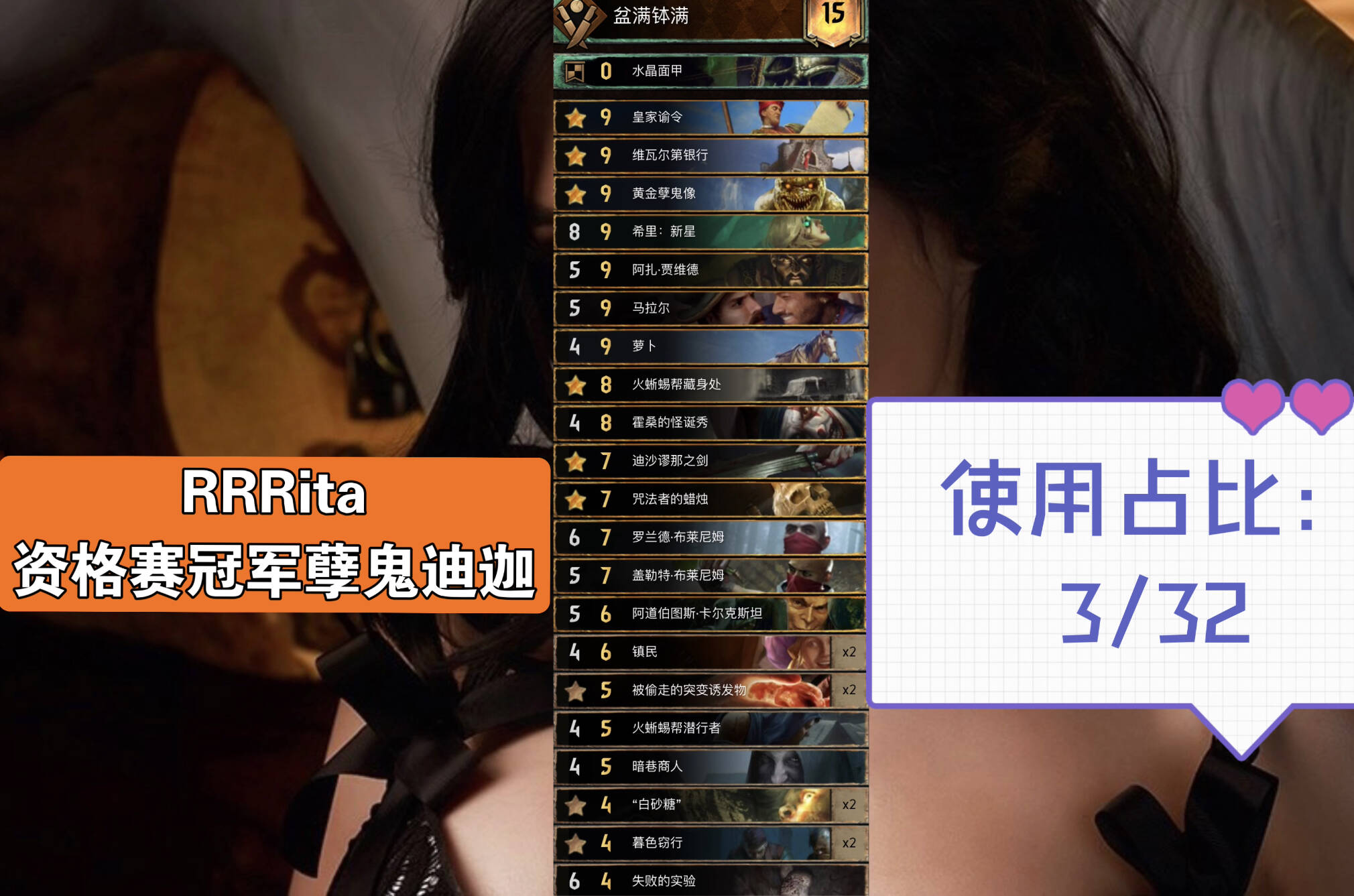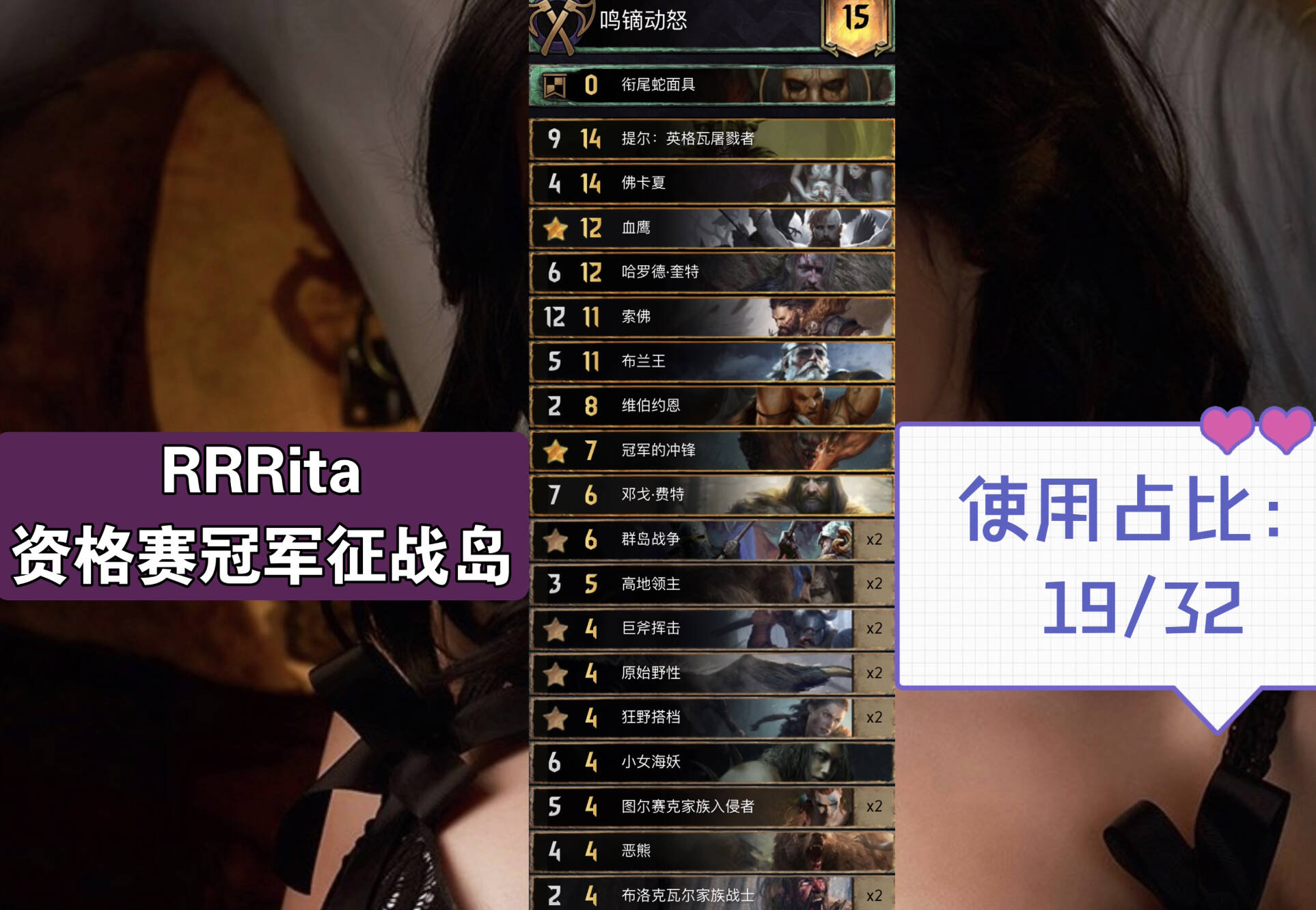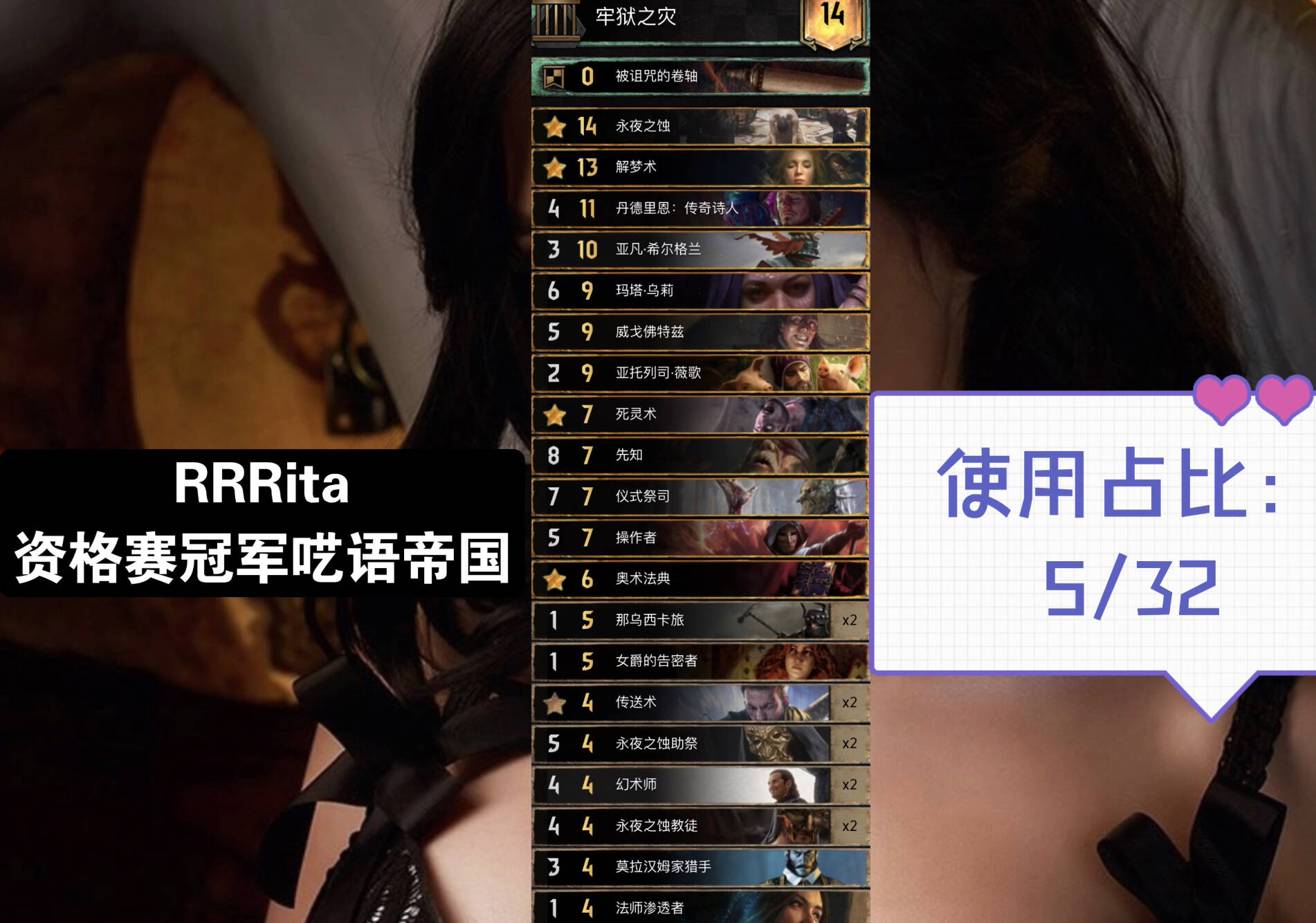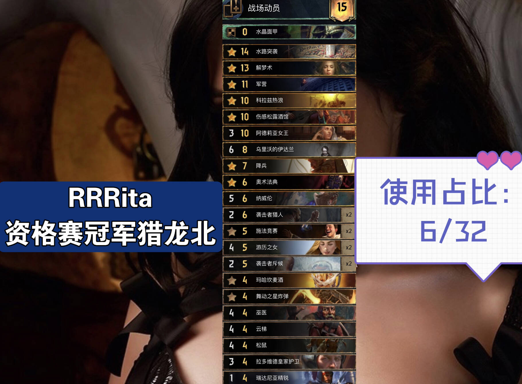 获奖感言:四套卡组里一套猎龙北,一套孽鬼自毒,一套征战,一套呓语,这个lineup是在RRRita群里练出来的,在面对主流构筑的时候有不小优势(然后最后被针对了(T▽T))。一般天梯什么卡组强势就会去尝试,练习(铁分奴),这次结果还算满意,32进4的时候走位不错,lineup上占了不少优势,现在想想可能第三天换个思路好一点。