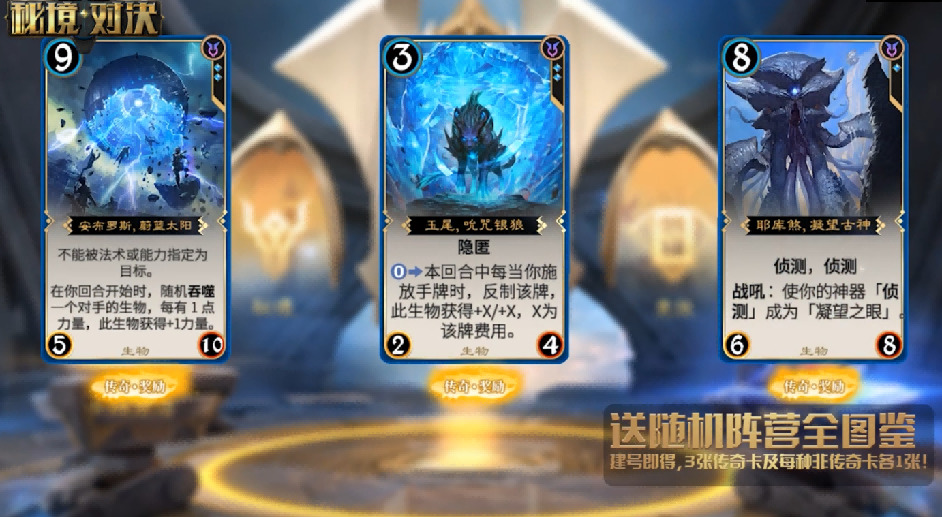 《秘境对决》为新玩家准备了诚意满满的开服福利!建号即送随机阵营全套卡牌,其中还包含3张传奇及每种非传奇卡各一张!
