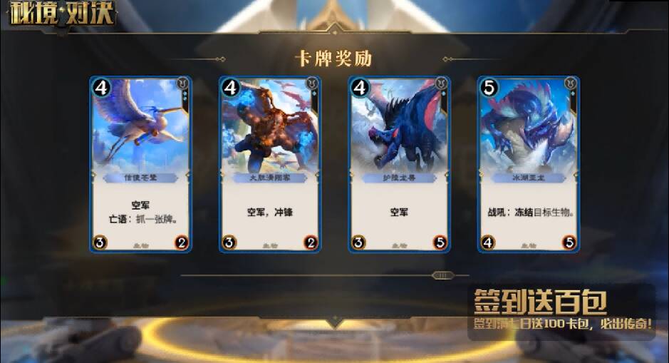 签到额外再送100卡包,必出传奇!新手不愁没卡,轻松尝试各种套路!此外,更有机会获得稀有卡背,尽显独一无二的牌神气质!