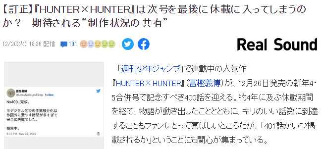 停载、重载,围绕着富坚的词汇在以勤奋见长的日本漫画家圈子里已经成为常用词汇,目前刚刚回复连载1个多月的《全职猎人》即将于12月26日迎来总第400话,不过粉丝们担心的则是,根据惯例或又要停载了。