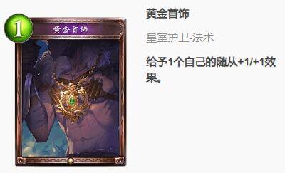 在灾祸十杰版本,皇家职业引入了新的财宝体系,黄金首饰就是其中的一张财宝卡,效果十分简单,是1张1费的,可以为自己的随从赋予+1/+1强化的法术。