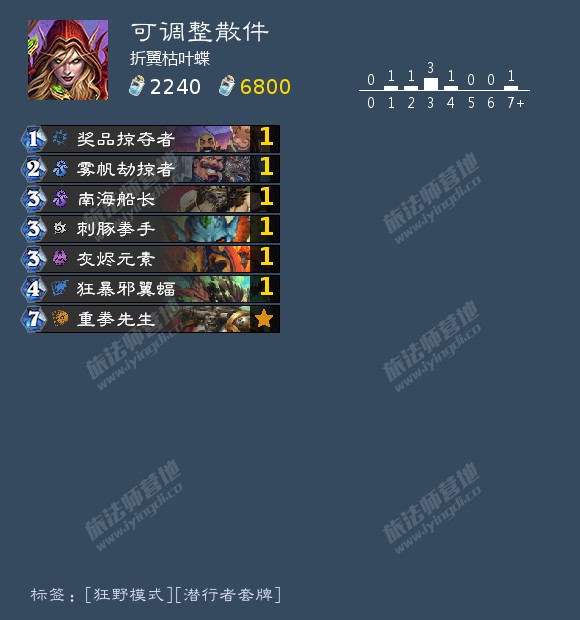 雾帆劫掠者和第二张刺豚拳手主要用于针对快攻,包括偶数萨、奇数骑等等,打同行更是必备,经常可以帮助返场;灰烬元素主要用来打法师(被开门法连续4个冰箱心态打崩了之后,我才果断带上了),对于现存的弃牌术也稍有克制,但本身不是海盗,一定程度上会稍微降低剑鱼探海盗的几率;如果碰到的控制卡组比较多,经常缺最后斩杀时的伤害的话,可以考虑带重拳先生,但个人用了一段时间感觉一般,毕竟前期抓到实在太卡手了。
