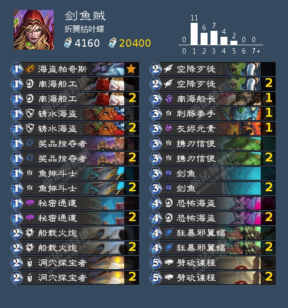 我们这套牌的随从除了1费的各种小杂毛和2费的两个船载火炮之外、主要就是免费的1-1海盗帕奇斯,免费的2-2空降歹徒、通常是免费的3-3狂暴邪翼蝠、提了剑鱼之后免费的3-3恐怖海盗。这么多的免费随从,意味着我们经常可以用非常低的费用,来铺一个对面看不懂的场面。这也是我们前期最主要的伤害来源,在对方有足够的费用使用解牌之前,我们就可以用这些免费的小东西们蹭掉对方大量的血。