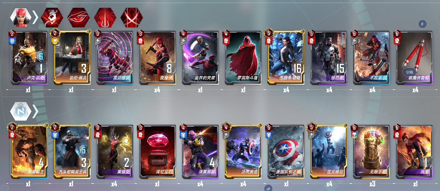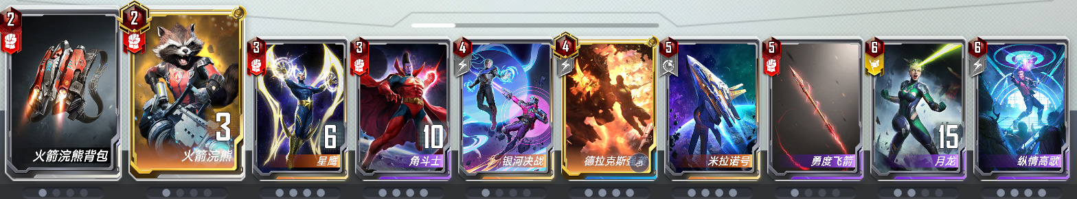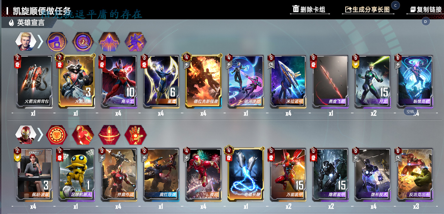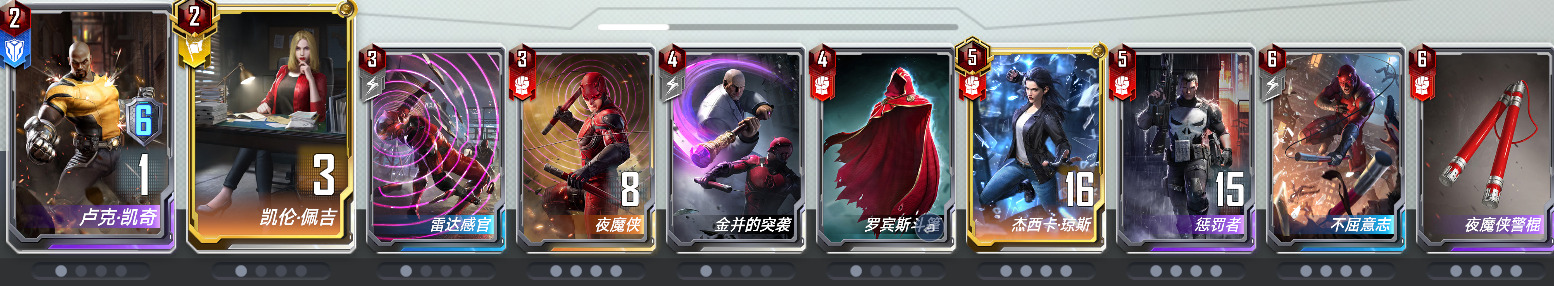 卢克凯奇×1:不同于其他的任务卡组,本套牌中卢克只需要带一张,目的是为了不拖慢前期的节奏,前期非必要不放上场,藏手里就可以(参考奥克耶)中期变阵后放上去凑链接嫖任务就好,指望张二费蓝卡当主C不是明智之选。