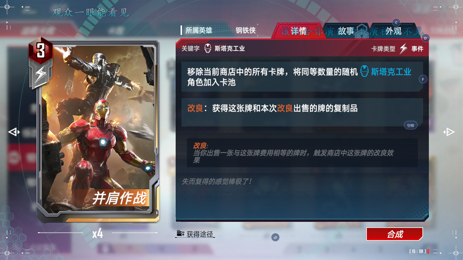 ④囤了一手的[并肩作战]同时商店里刷了[肩扛导弹]之后把功能性单卡尽量回手,没用的卡全部卖掉,用来给主C刷[肩扛导弹]的战力,同时也是增加改良次数,方便必要时后期可以启动[反浩克出击]提升战力。举例: