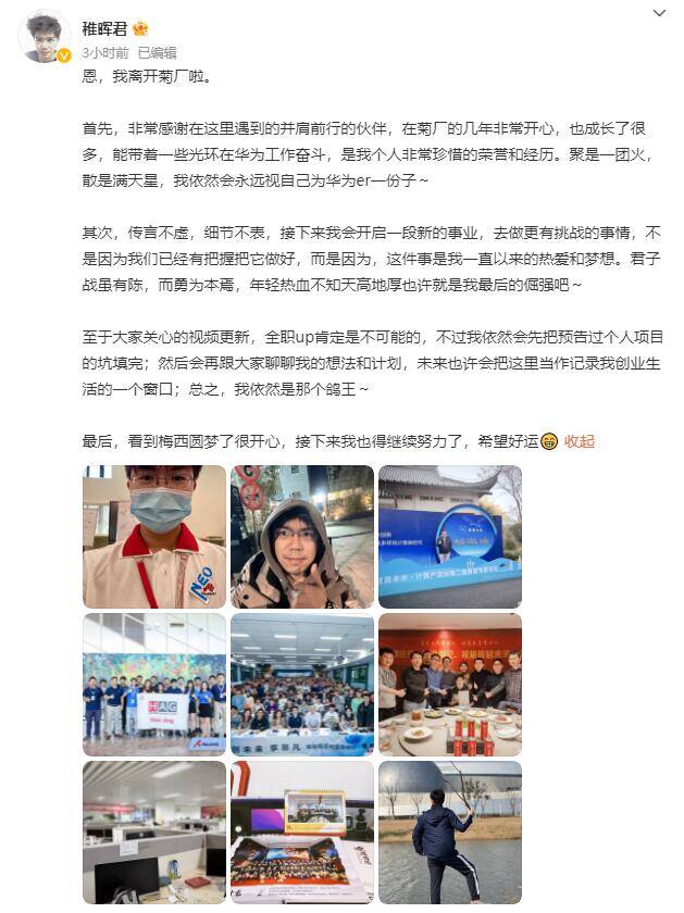 今天中午,稚晖君本人在微博发文回应称传言属实,已经离开华为,将开始创业。