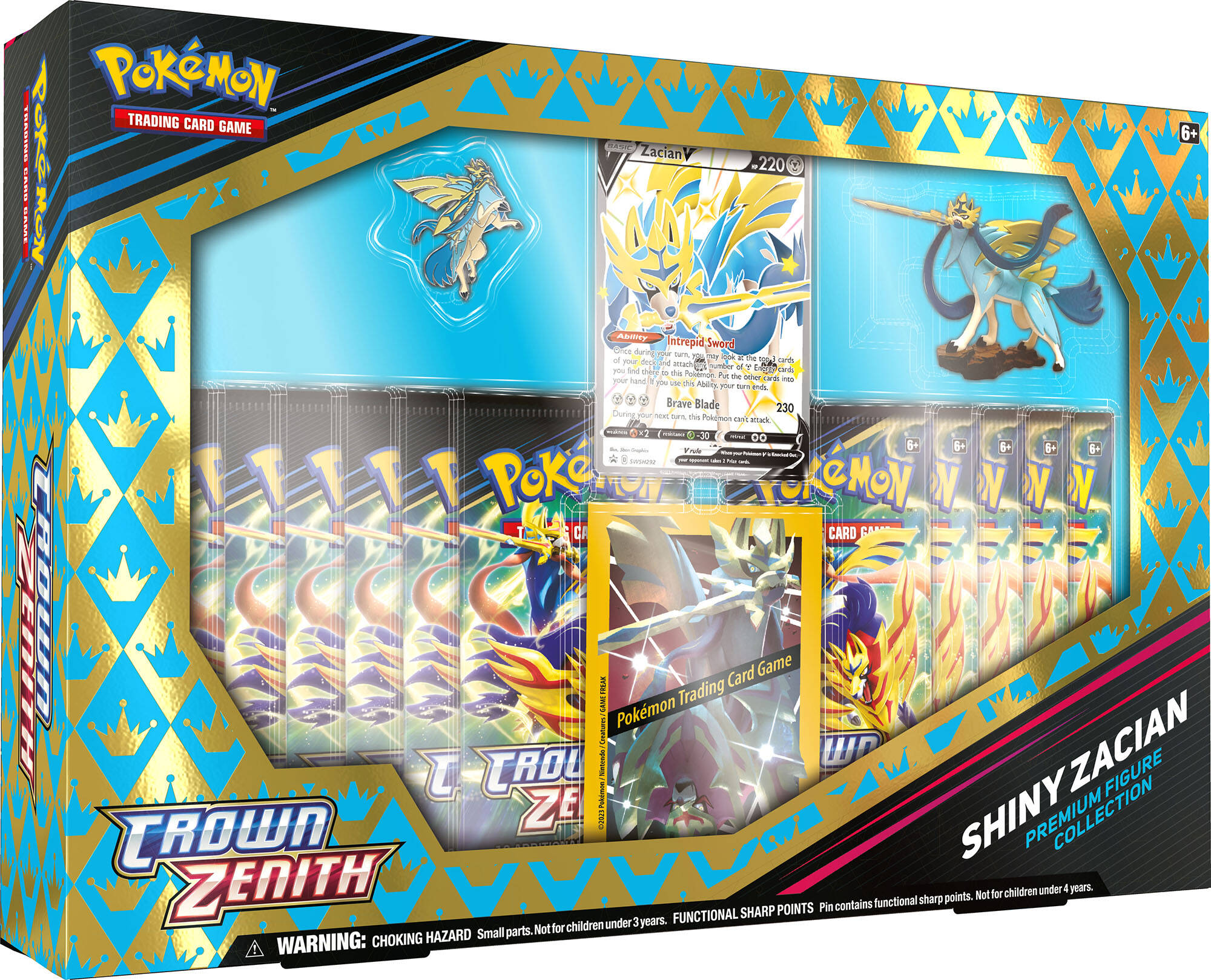 包括11个Crown ZenithBooster Pack;一张印有闪光苍响V或闪光藏玛然特V的PROMO卡;一个对应的模型和一个胸针;和一套卡套。