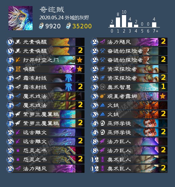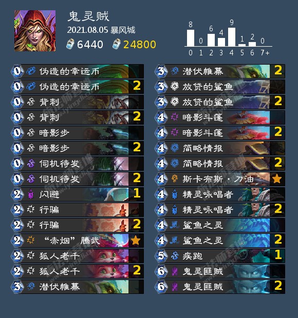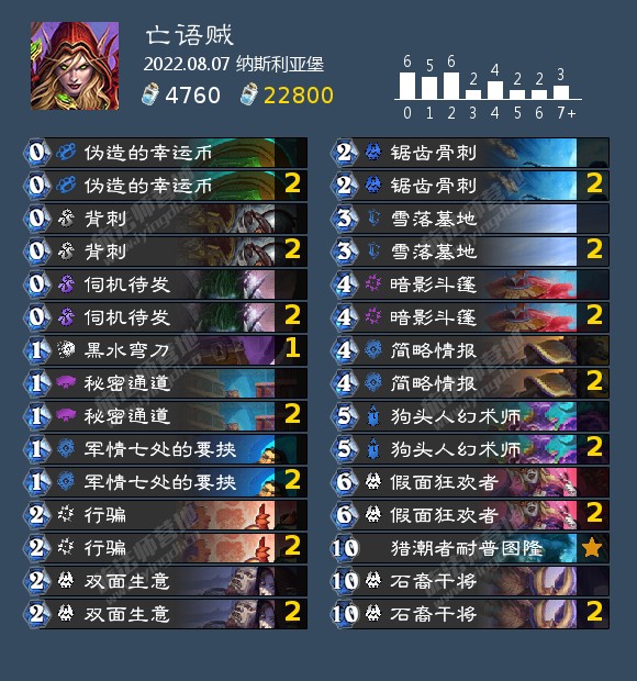 狗头人幻术师和简略情报形成配合后,在加上纳斯利亚堡的悬案带来的石裔干将和假面狂欢者,上能锤慢速下能锤快攻的亡语贼诞生了。不过,设计师也很快注意到了亡语贼的强势,该卡组没多久就成为了废案。