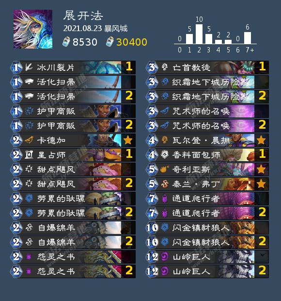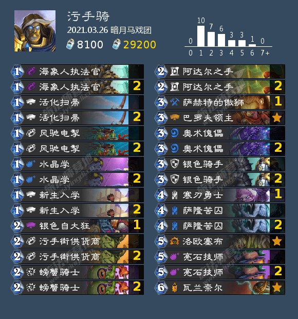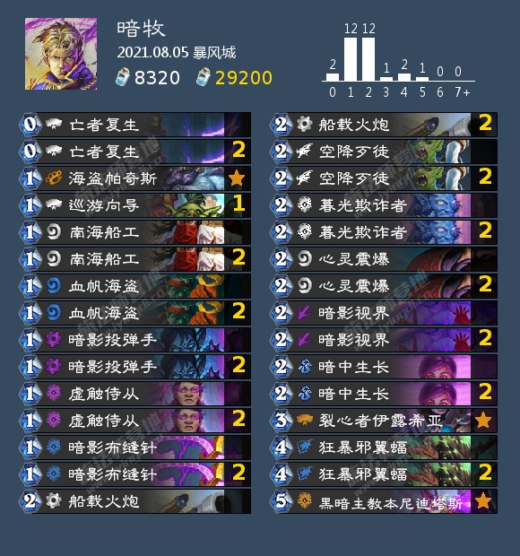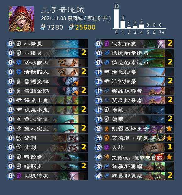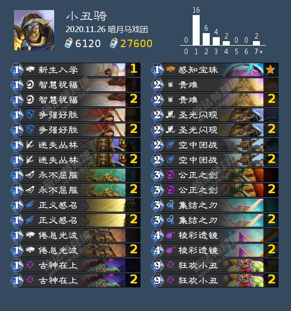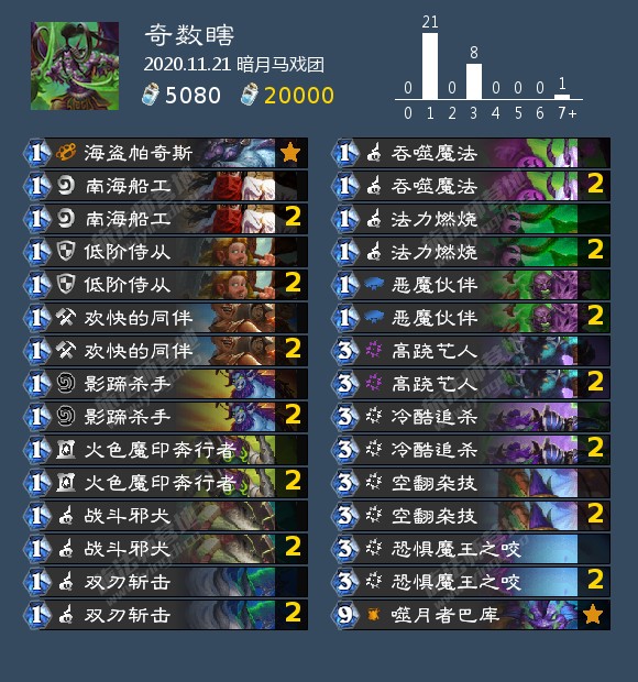 暗月马戏团版本,由于高跷艺人的登场,完全放弃3费以上随从的奇数瞎构筑第一次出现,虽然该卡组并不是当时奇数瞎的最强形态,但却是最初形态。下面这套奇数瞎各位读者朋友应该更容易接受。