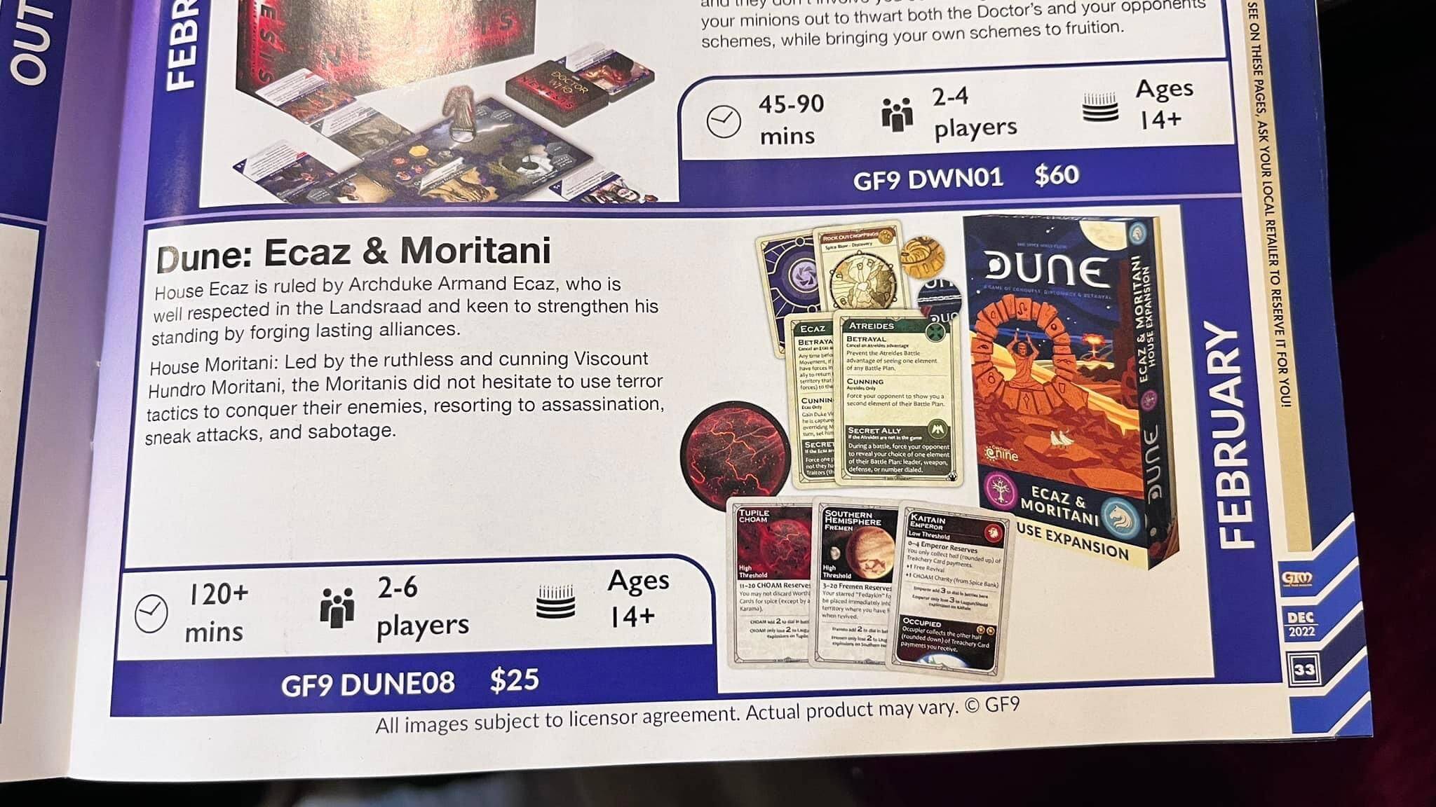 Gale Force Nine将在今年发行经典区控桌游《Dune》(2019年版)的新扩展《Dune: Ecaz & Moritani》,埃卡兹和莫里塔尼两个家族将加入游戏。