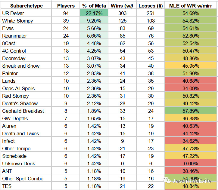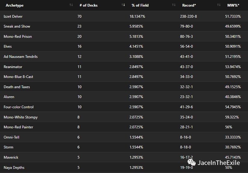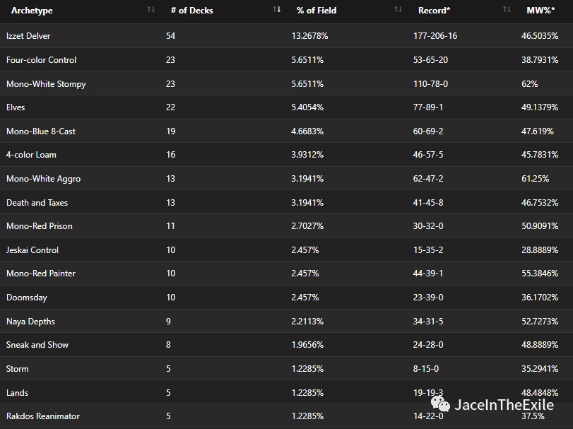 和EW北美同时举办的EW MO则是一个更加功利的环境,掘密师军团也差不多倾巢出动占到了22%,而先制白由于只要花钱就能一秒组出来,打完了还能亏点钱卖给bot,也有9%的占比率。而EW MO由于牌手都有很多绝活哥和真爱粉,相对另外两场EW来说,套牌种类也是最多的。尽管前16名都没有掘坟,掘坟的合计胜率难得上了一次50,这场EWmeta率超过5%的只有掘密师、先制白、妖精和掘坟。唯一超过55胜率的只有章人早餐。(笔者是GW depths的7分之1,给胜率拉后腿了5555)