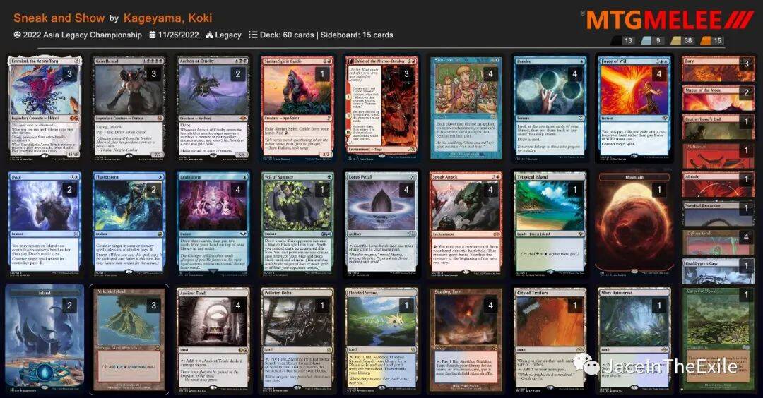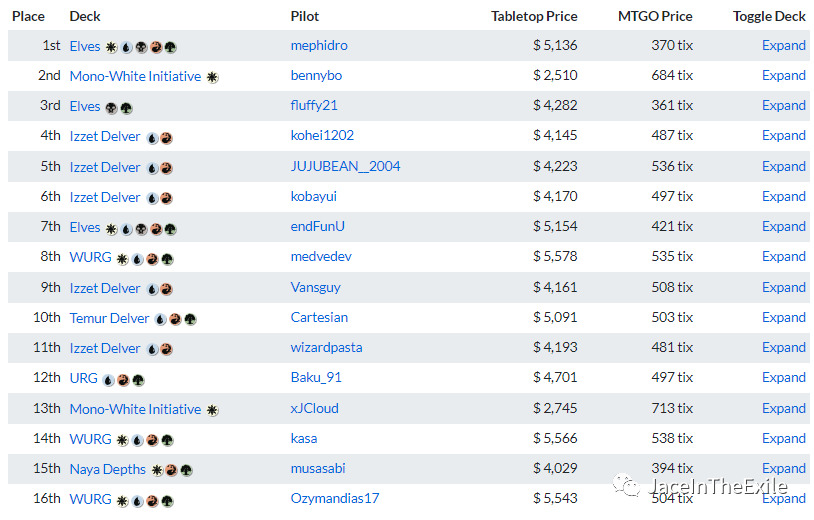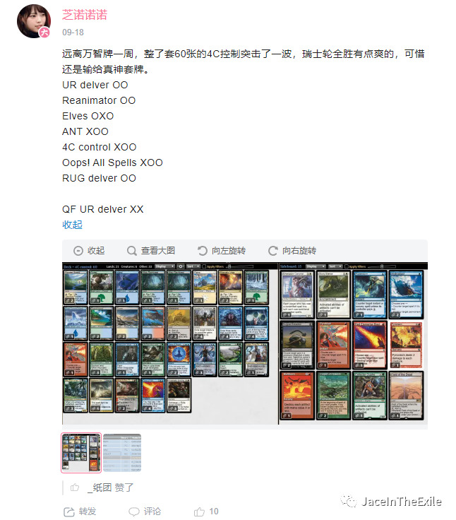 这场相对来说创新性就弱一点了,因为基本能打到高胜的牌手使用的都是成名套牌,最多也就根据大环境预测做一些微调,比如三套掘密师的表都只有一些微幅调动,而前16的4C控制基本都是一个模板,没有什么大刀阔斧的更新。