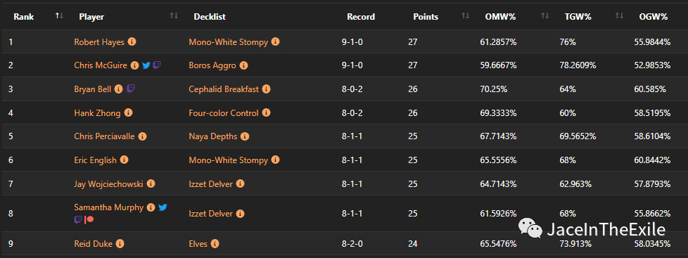 可以看到八强分别是2x先制白、先制红白、章人早餐、4C控制、纳雅深渊、2x掘密师。以及reid duke的妖精老九。如果先制红白和先制白归为一套牌的话,实际上八强的先制含量已经超过掘密师了,这是三个月前的我们难以想象的。而reid也没有使用今年下半年最流行的塑生邪魔版本的妖精而是带回了以前爆发力十足的自然瞥视妖精,这个版本答案其实并不难发现,对于先制白这种靠单兵场面袭击的,妖精既可以用虫子周旋也可以三回合陨蹄带走,即使一回合圣杯也有满编的牧者/绿阳来过掉,没能进入八强淘汰赛只能说非常可惜,因为看起来3~8名基本都是最后一轮约合掉了。