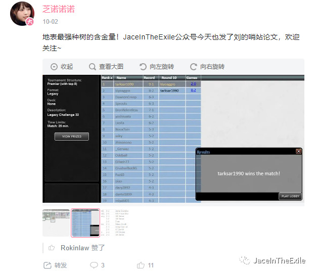 秋日(TES):最难忘的对局是线下打掘密师主牌局15血倒胃口翻eoe加relay吃了两个bolt。还有打控制连开三个relay把牌库打空用卷须和闲散单吃歼智陷阱,最后用哥布林把对面踢死。展望都是老生常谈了,取消rl,线下官方比赛,wszsb。