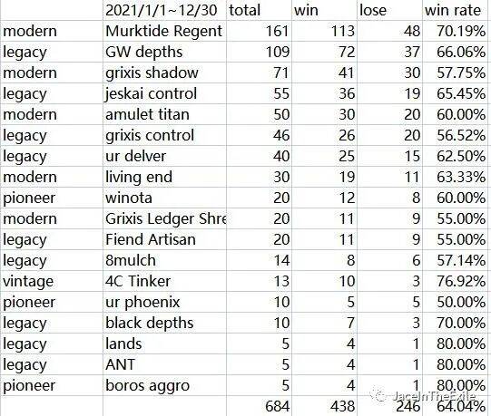 相比2021年玩白绿深渊时勤能补拙的肌肉记忆,2022年我的核心重点有很长一段时间是放在练习新套牌上的,甚至今年下来我MO玩的最多的套牌其实是摩登的红蓝龙候,然后薪传的洁斯凯控制和掘密师(下半年其实一直在玩,只是没记录了,掘密师大概打了也快100把了),不过加上这些今年可能也就打了800把,远没有去年多。按这个递减关系明年怕是只能打400把MO了,希望是因为周末去各种地方参加实体比赛让我没空打吧~