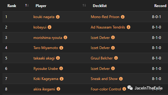 八强:3x掘密师、三定红、SNT、ANT、Belcher、4C控制。从总套牌meta可以看出日本的SNT和ANT死忠玩家是真的多,两者的套牌meta都在3%以上,而掘密师毫不意外的占到了18%,而这个表里最恐怖的数据其实应该是先制白高达59.3%的非镜像局胜率,线下由于收牌、真爱程度、熟练度等诸多因素先制白的meta率没有那么高。