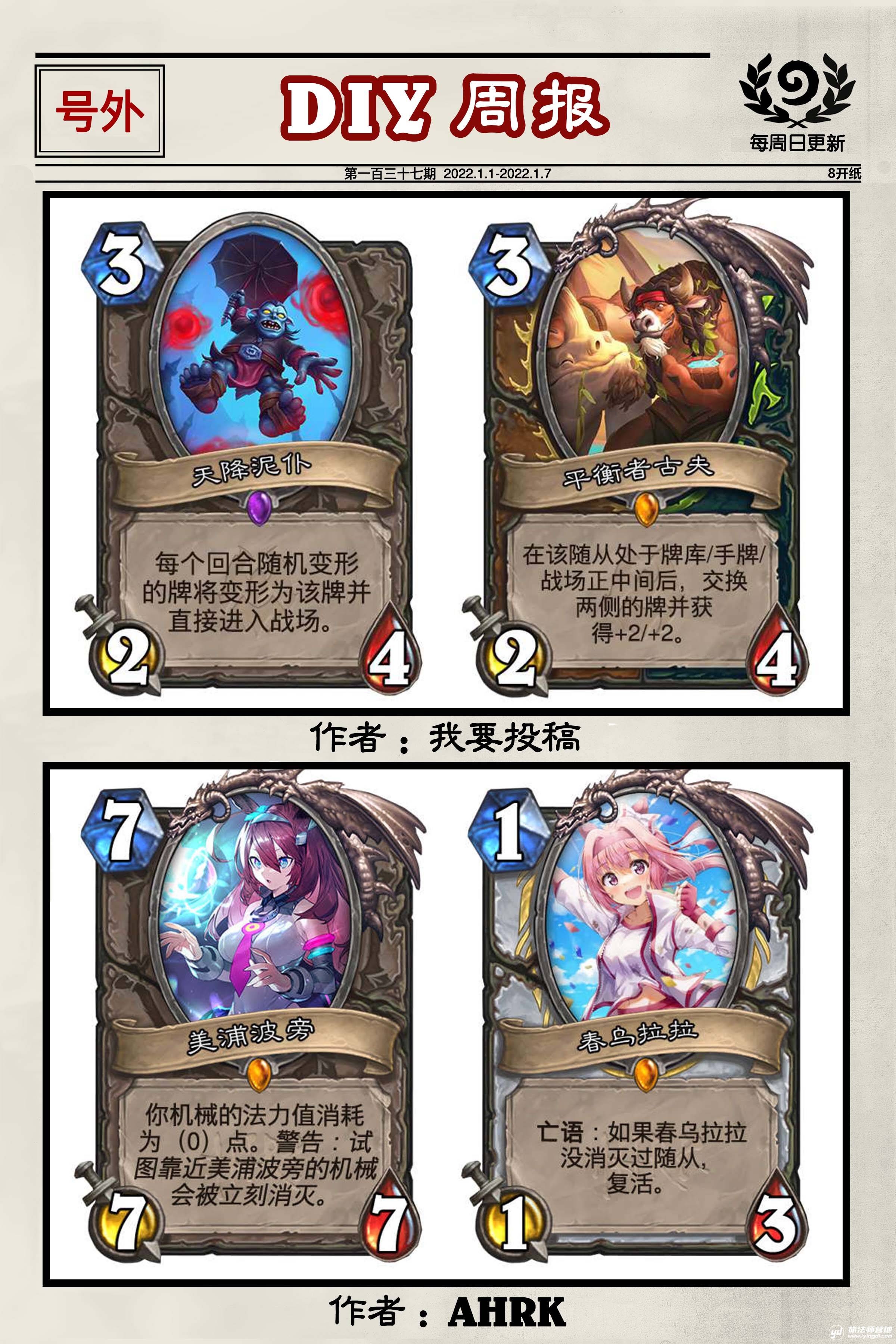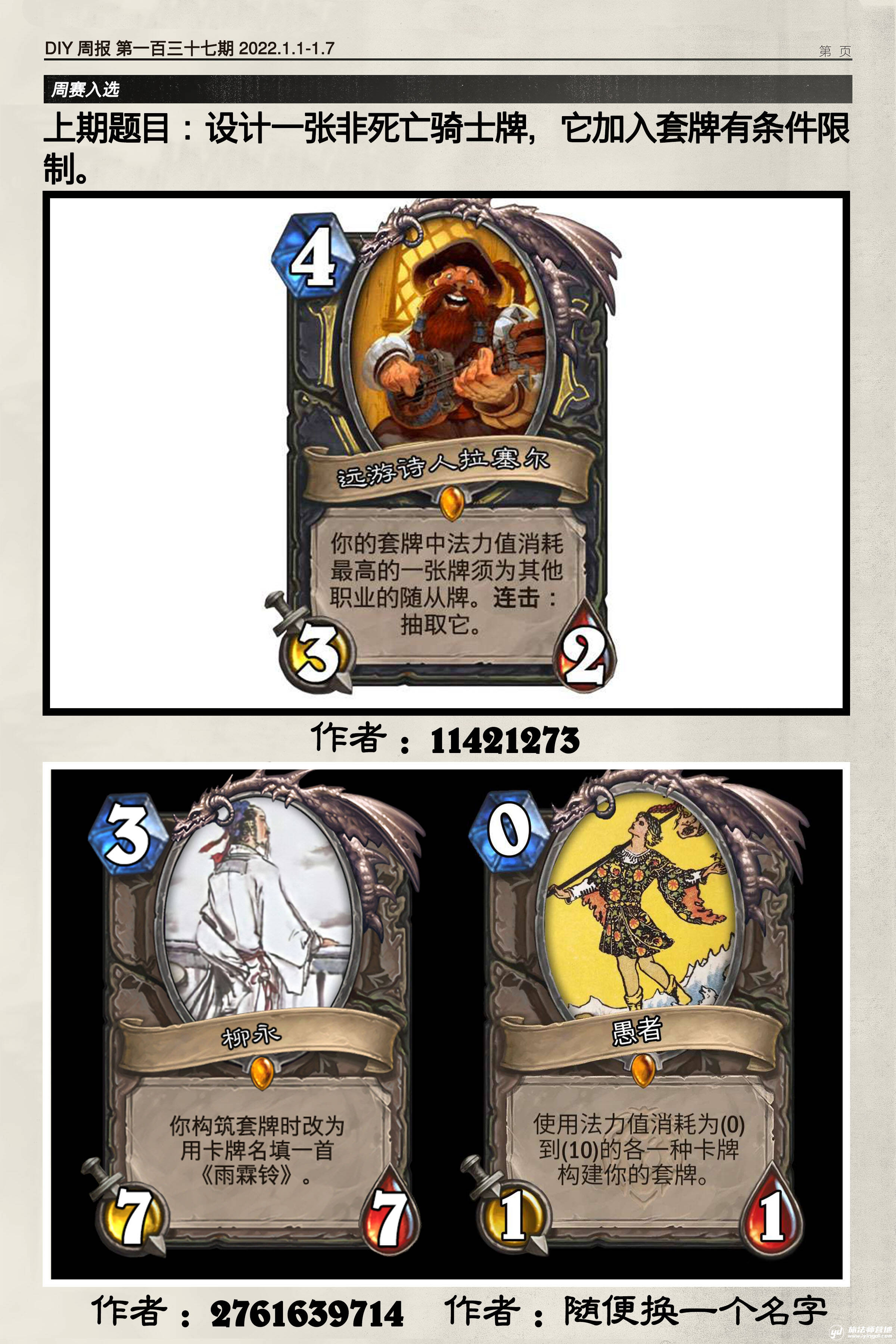 本期题目是一个极端表达派的题目,但是却要求作出游戏性设计。在炉石传说diy逐渐纷乱庞杂的今天,你是否有时也会觉得我们需要抽出一点时间返回头去,回望一下炉石传说设计的故乡和原点?这是我本次出题的目的。这样的题目容易变成旧稿储备比拼,但就算是这样,能把一个旧思路找到合适的皮,做出贴合题意的好处理那也是一种本领。