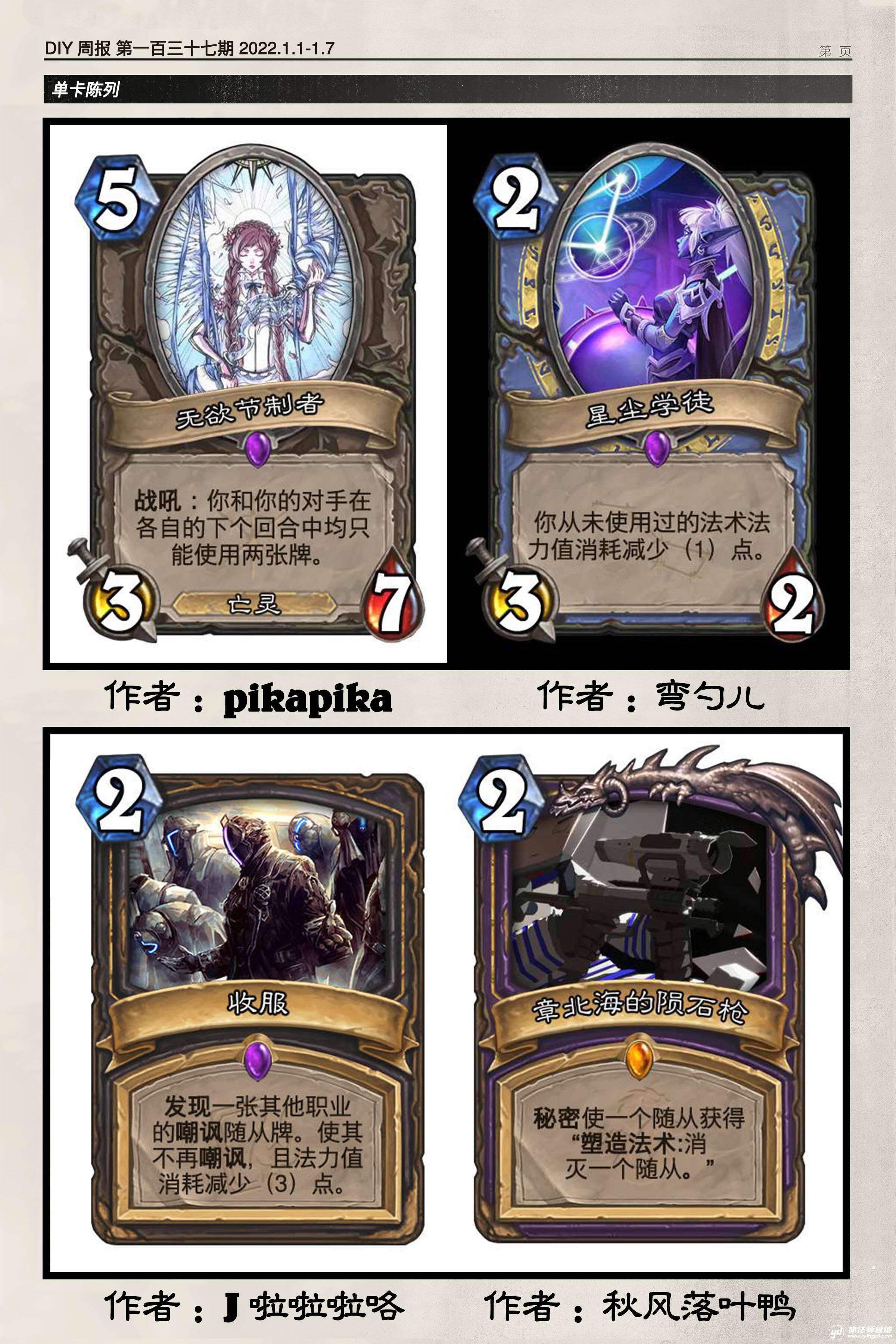 最近这段时间和大家聊过好多次各种领域里自限式创作,而在炉石设计比赛的语境中,最适合进行自限式创作的便是要求设计多张卡的题目;事实上,我首次听闻这个理论(reddit 80K Battle Royale)和首次在吧里分享这个理论(2019年冬幕赛)都是出于多卡设计的契机。通论告诉我们,创作空间越大,自限式创作就越适用。在要求设计多张卡牌的题目下,参赛者的投稿空间确实比平时更大:如果每张牌都有n种选择,那么两张牌组合投稿的选择数便是n^2;这种情况下,不进行积极的自限,既会让处于创作端的你迷失方向,也会让处于阅读端的吧友们感受不到作品的特别之处。不仅如此,多卡设计也非常方便进行自限——选择一个主题进行围绕创作,设计能够产生有趣combo的多张牌,设计一个cycle(本质是排比)或是使用其他修辞方式——这些平日在单卡比赛中无法使用的技巧都可以在多卡比赛里起到很好的自限效果。写到这里本想推荐吧友们借此机会尝试一下(姑且算是近期热点话题(?)的)自限式创作,但好像等你们看到这段评论的时候比赛已经结束了……总之,思想无内容则空,直观无概念则盲;我引用这句和本段评论半毛钱关系都没有的句子是想说,对漫无边际的创作行为进行些许的自限对于设计才能并不超群的作者来说是一个提升作品质量的好办法。